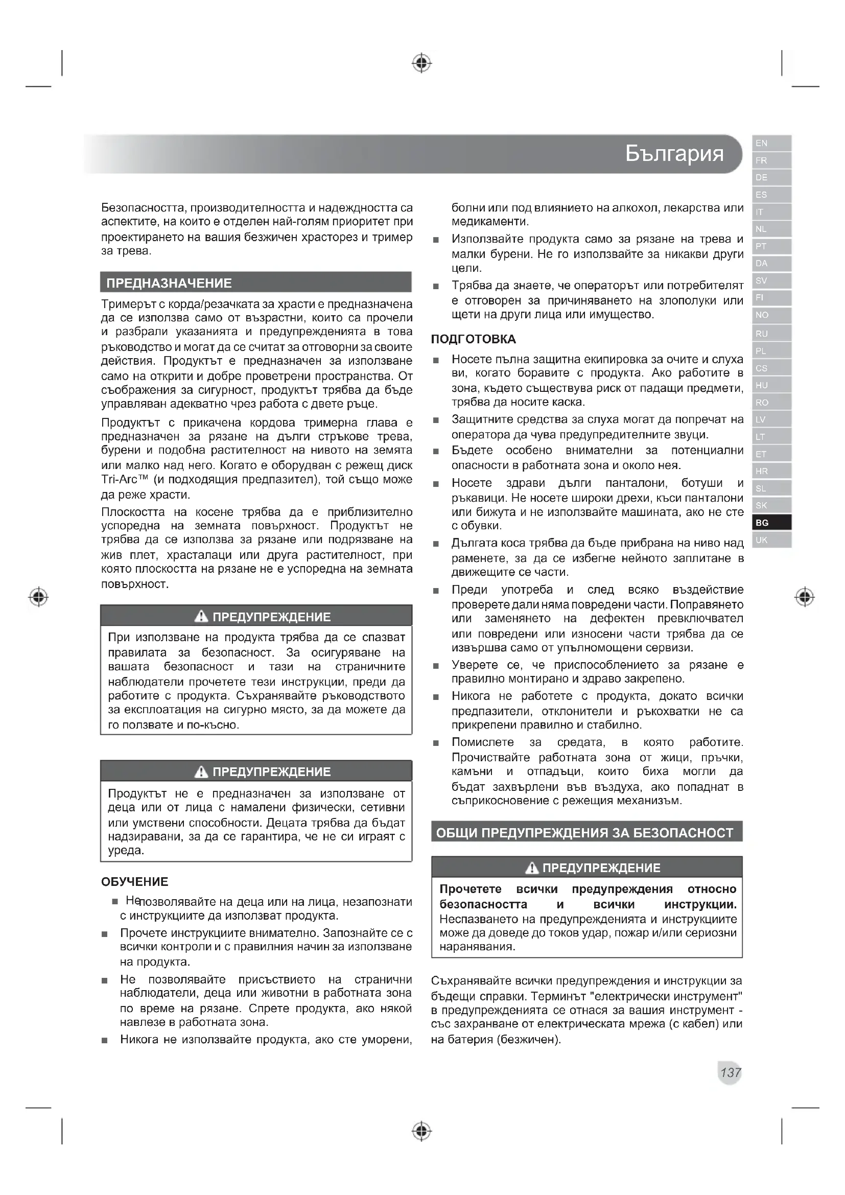 ■ Дългата коса трябва да бъде прибрана на ниво над раменете, за да се избегне нейното заплитане в движещите се части. ■ Преди употреба и след всяко въздействие проверете дали няма повредени части. Поправянето или заменянето на дефектен превключвател или повредени или износени части трябва да се извършва само от упълномощени сервизи. ■ Уверете се, че приспособлението за рязане е правилно монтирано и здраво закрепено. ■ Никога не работете с продукта, докато всички предпазители, отклонители и ръкохватки не са прикрепени правилно и стабилно. ■ Помислете за средата, в която работите. Прочиствайте работната зона от жици, пръчки, камъни и отпадъци, които биха могли да бъдат захвърлени във въздуха, ако попаднат в съприкосновение с режещия механизъм. ОБЩИ ПРЕДУПРЕЖДЕНИЯ ЗА БЕЗОПАСНОСТ ПРЕДУПРЕЖДЕНИЕ Прочетете всички предупреждения относно безопасността и всички инструкции. Неспазването на предупрежденията и инструкциите може да доведе до токов удар, пожар и/или сериозни наранявания. Съхранявайте всички предупреждения и инструкции за бъдещи справки. Терминът "електрически инструмент" в предупрежденията се отнася за вашия инструмент - със захранване от електрическата мрежа (с кабел) или на батерия (безжичен).България
