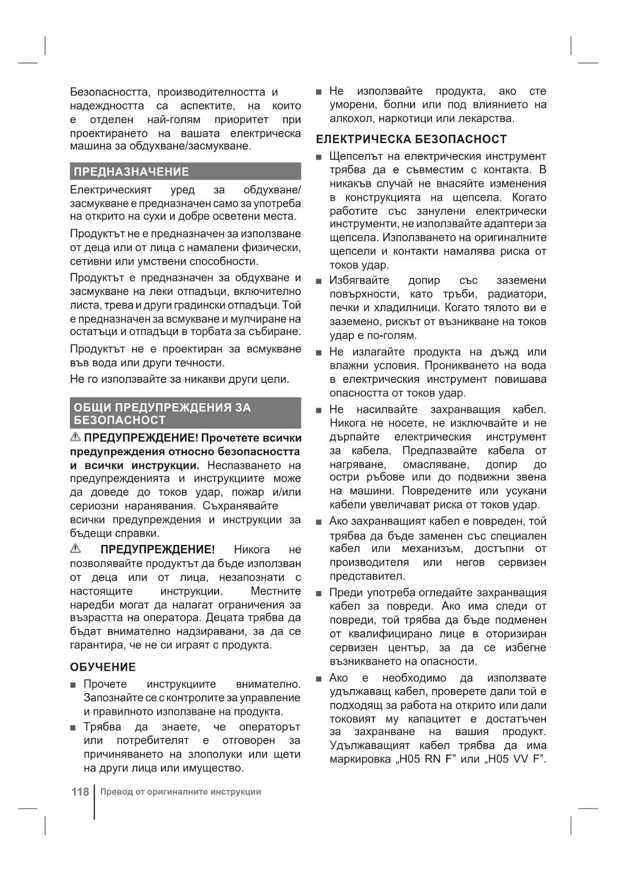 ■ Прочете инструкциите внимателно. Запознайте се с контролите за управление и правилното използване на продукта. ■ Трябва да знаете, че операторът или потребителят е отговорен за причиняването на злополуки или щети на други лица или имущество. ■ Не използвайте продукта, ако сте уморени, болни или под влиянието на алкохол, наркотици или лекарства. ЕЛЕКТРИЧЕСКА БЕЗОПАСНОСТ ■ Щепселът на електрическия инструмент трябва да е съвместим с контакта. В никакъв случай не внасяйте изменения в конструкцията на щепсела. Когато работите със занулени електрически инструменти, не използвайте адаптери за щепсела. Използването на оригиналните щепсели и контакти намалява риска от токов удар. ■ Избягвайте допир със заземени повърхности, като тръби, радиатори, печки и хладилници. Когато тялото ви е заземено, рискът от възникване на токов удар е по-голям. ■ Не излагайте продукта на дъжд или влажни условия. Проникването на вода в електрическия инструмент повишава опасността от токов удар. ■ Не насилвайте захранващия кабел. Никога не носете, не изключвайте и не дърпайте електрическия инструмент за кабела. Предпазвайте кабела от нагряване, омасляване, допир до остри ръбове или до подвижни звена на машини. Повредените или усукани кабели увеличават риска от токов удар. ■ Ако захранващият кабел е повреден, той трябва да бъде заменен със специален кабел или механизъм, достъпни от производителя или негов сервизен представител. ■ Преди употреба огледайте захранващия кабел за повреди. Ако има следи от повреди, той трябва да бъде подменен от квалифицирано лице в оторизиран сервизен център, за да се избегне възникването на опасности. ■ Ако е необходимо да използвате удължаващ кабел, проверете дали той е подходящ за работа на открито или дали токовият му капацитет е достатъчен за захранване на вашия продукт. Удължаващият кабел трябва да има маркировка „H05 RN F” или „H05 VV F”.