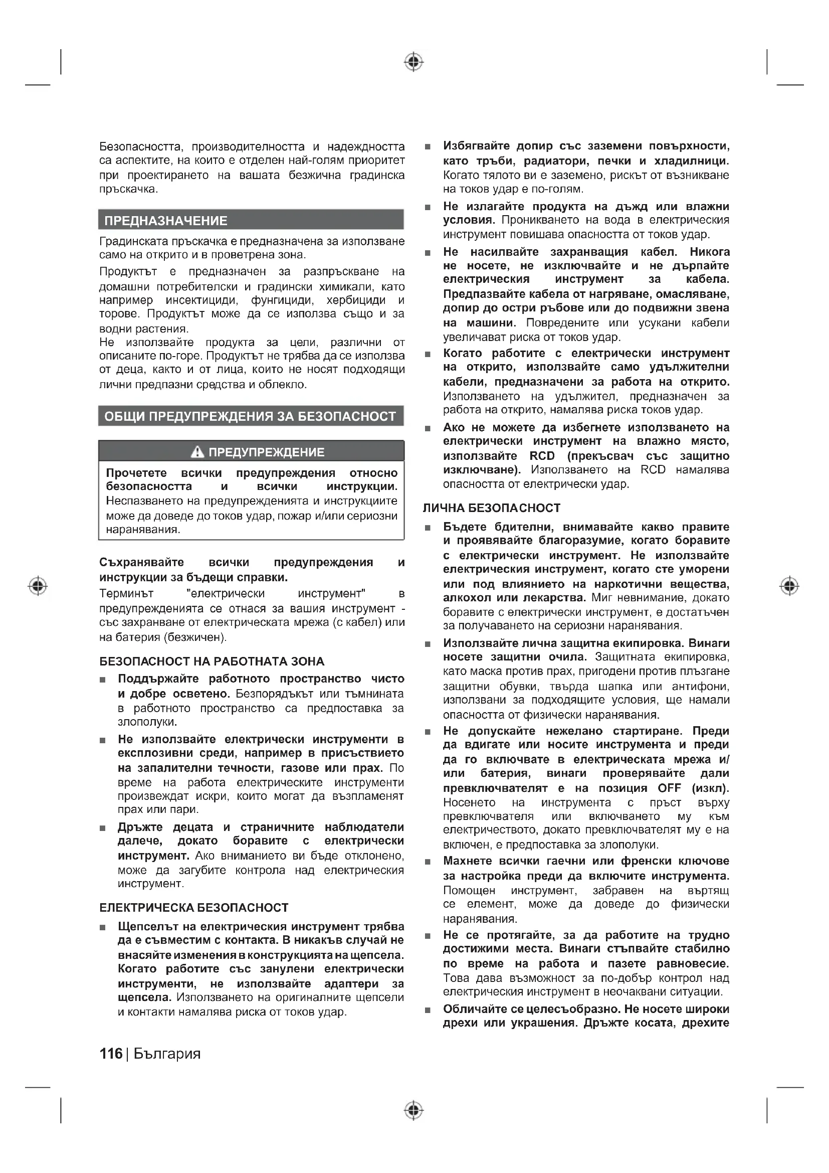 ПРЕДНАЗНАЧЕНИЕ Градинската пръскачка е предназначена за използване само на открито и в проветрена зона. Продуктът е предназначен за разпръскване на домашни потребителски и градински химикали, като например инсектициди, фунгициди, хербициди и торове. Продуктът може да се използва също и за водни растения. Не използвайте продукта за цели, различни от описаните по-горе. Продуктът не трябва да се използва от деца, както и от лица, които не носят подходящи лични предпазни средства и облекло. ОБЩИ ПРЕДУПРЕЖДЕНИЯ ЗА БЕЗОПАСНОСТ ПРЕДУПРЕЖДЕНИЕ Прочетете всички предупреждения относно безопасността и всички инструкции. Неспазването на предупрежденията и инструкциите може да доведе до токов удар, пожар и/или сериозни наранявания. Съхранявайте всички предупреждения и инструкции за бъдещи справки. Терминът "електрически инструмент" в предупрежденията се отнася за вашия инструмент - със захранване от електрическата мрежа (с кабел) или на батерия (безжичен).