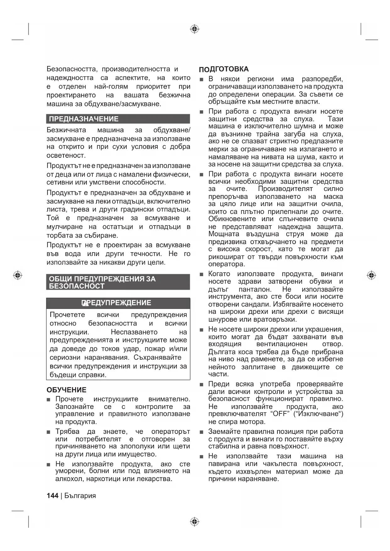 ■ Прочете инструкциите внимателно. Запознайте се с контролите за управление и правилното използване на продукта. ■ Трябва да знаете, че операторът или потребителят е отговорен за причиняването на злополуки или щети на други лица или имущество. ■ Не използвайте продукта, ако сте уморени, болни или под влиянието на алкохол, наркотици или лекарства.