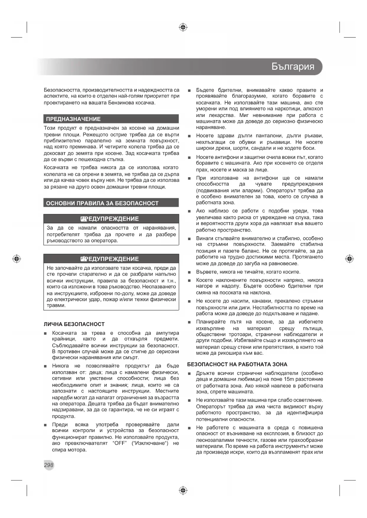 ■ Преди всяка употреба проверявайте дали всички контроли и устройства за безопасност функционират правилно. Не използвайте продукта, ако превключвателят “ОFF” (“Изключване“) не спира мотора. ■ Бъдете бдителни, внимавайте какво правите и проявявайте благоразумие, когато боравите с косачката. Не използвайте тази машина, ако сте уморени или под влиянието на наркотици, алкохол или лекарства. Миг невнимание при работа с машината може да доведе до сериозно физическо нараняване. ■ Носете здрави дълги панталони, дълги ръкави, нехлъзгащи се обувки и ръкавици. Не носете широки дрехи, шорти, сандали и не ходете боси. ■ Носете антифони и защитни очила всеки път, когато боравите с машината. Ако при косенето се отделя прах, носете и маска за лице. ■ При използване на антифони ще се намали способността да чувате предупреждения (подвиквания или аларми). Операторът трябва да е особено внимателен за това, което се случва в работната зона. ■ Ако наблизо се работи с подобни уреди, това увеличава както риска от увреждане на слуха, така и вероятността други хора да навлязат във вашето работно пространство. ■ Винаги стъпвайте внимателно и стабилно, особено на стръмни повърхности. Заемайте стабилна позиция и пазете баланс. Не се протягайте, за да работите на трудно достижими места. Протягането може да доведе до загуба на равновесие. ■ Вървете, никога не тичайте, когато косите. ■ Косете наклонените повърхности напряко, никога нагоре и надолу. Бъдете особено бдителни при смяна на посоката на наклона. ■ Не косете до насипи, канавки, прекалено стръмни повърхности или диги. Нестабилността по време на работа може да доведе до подхлъзване и падане. ■ Планирайте пътя на косене, за да избегнете изхвърляне на материал срещу пътища, обществени тротоари, странични наблюдатели и други подобни. Избягвайте също и изхвърлянето на материал срещу стени или препятствия, в които той може да рикошира към вас. БЕЗОПАСНОСТ НА РАБОТНАТА ЗОНА ■ Дръжте всички странични наблюдатели (особено деца и домашни любимци) на поне 15m разстояние от работната зона. Ако някой навлезе в работната зона, спрете машината. ■ Не използвайте тази машина при слабо осветление. Операторът трябва да има чиста видимост върху работното пространство, за да идентифицира потенциални опасности. ■ Не работете с машината в среда с повишена опасност от възникване на експлозия, в близост до леснозапалими течности, газове или прахообразни материали. По време на работа инструментът може да произведе искри, които да възпламенят прах илиБългария