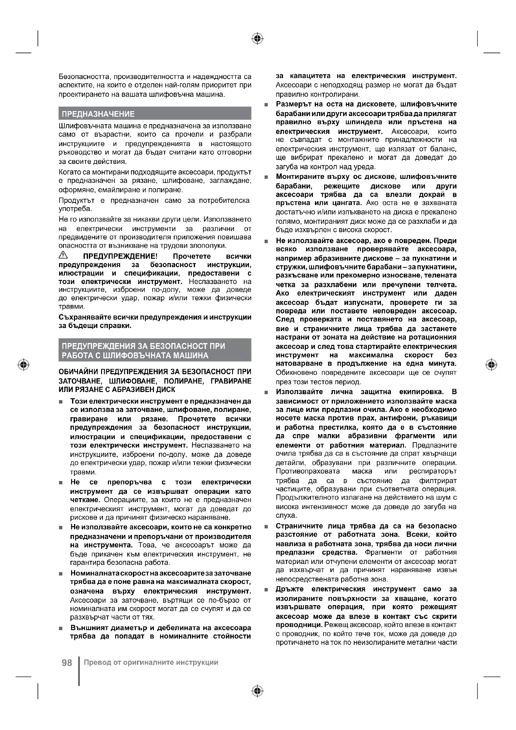 ELБезопасността, производителността и надеждността са аспектите, на които е отделен най-голям приоритет при проектирането на вашата шлифовъчна машина. ПРЕДНАЗНАЧЕНИЕ Шлифовъчната машина е предназначена за използване само от възрастни, които са прочели и разбрали инструкциите и предупрежденията в настоящото ръководство и могат да бъдат считани като отговорни за своите действия. Когато са монтирани подходящите аксесоари, продуктът е предназначен за рязане, шлифоване, заглаждане, оформяне, емайлиране и полиране. Продуктът е предназначен само за потребителска