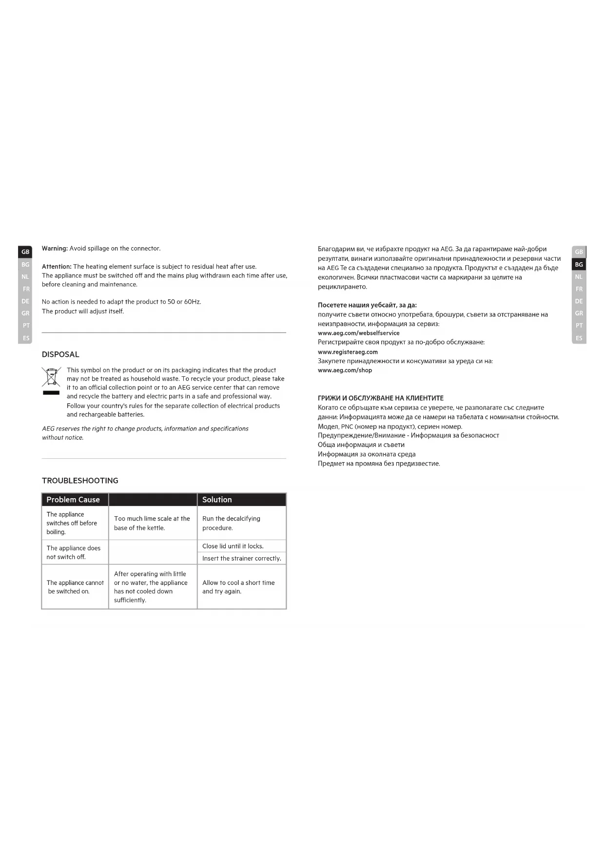 след ползване. Уредът трябва да се изключи и щепселът да се извади всеки път след употреба, преди почистване и поддръжка. Не са необходими действия за адаптиране на продукта към 50 или 60 Hz. Продуктът ще се регулира сам. AEG си запазва правото да променя продукти, информация и спецификации без предизвестие.