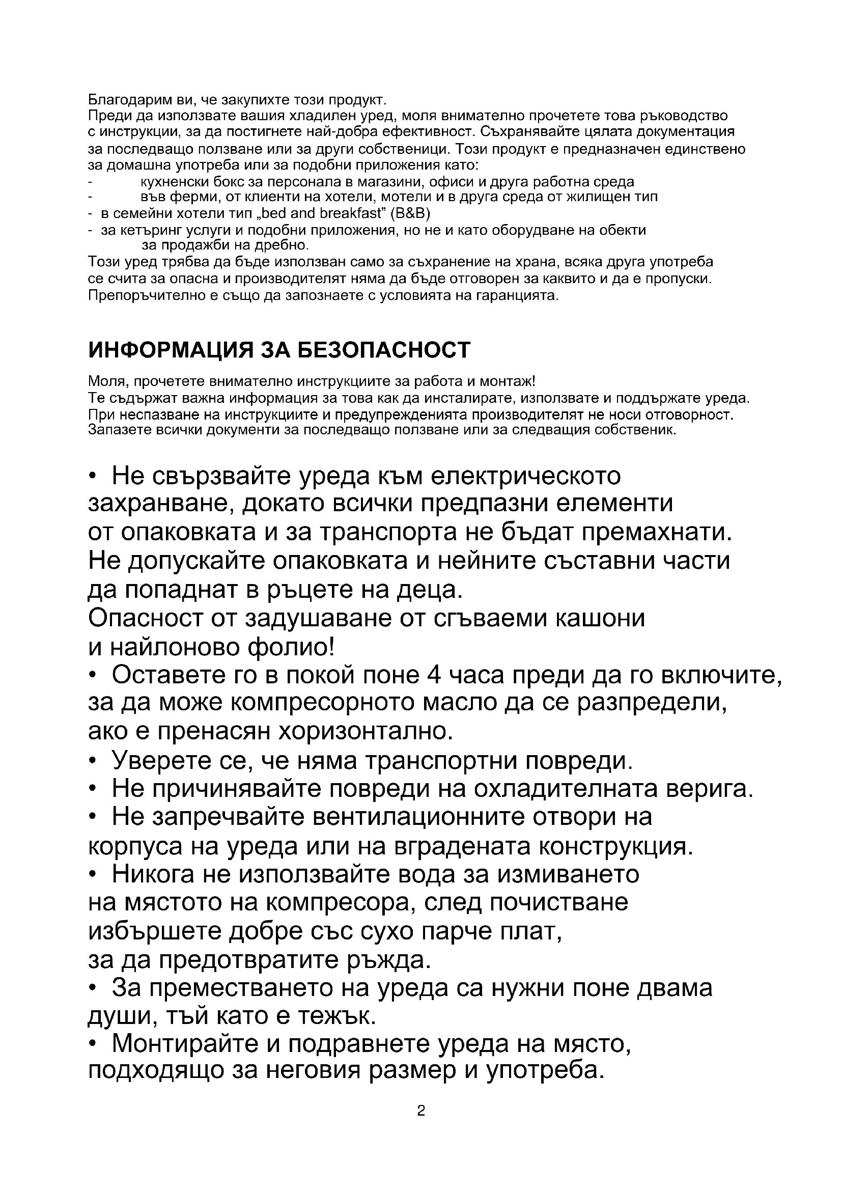 - ТЕХНИЧЕСКА ПОМОЩ Информация за б езопасност Благодарим ви, че закупихте този продукт. Преди да използвате вашия хладилен уред, моля внимателно прочетете това ръководство с инструкции, за да постигнете най-добра ефективност. Съхранявайте цялата документация за последващо ползване или за други собственици. Този продукт е предназначен единствено за домашна употреба или за подобни приложения като: - кухненски бокс за персонала в магазини, офиси и друга работна среда - във ферми, от клиенти на хотели, мотели и в друга среда от жилищен тип - в семейни хотели тип „bed and breakfast” (B&B) - за кетъринг услуги и подобни приложения, но не и като оборудване на обекти за продажби на дребно. Този уред трябва да бъде използван само за съхранение на храна, всяка друга употреба се счита за опасна и производителят няма да бъде отговорен за каквито и да е пропуски. Препоръчително е също да запознаете с условията на гаранцията. ИНФОРМАЦИЯ ЗА БЕЗОПАСНОСТ Моля, прочетете внимателно инструкциите за работа и монтаж! Те съдържат важна информация за това как да инсталирате, използвате и поддържате уреда. При неспазване на инструкциите и предупрежденията производителят не носи отговорност. Запазете всички документи за последващо ползване или за следващия собственик. p. 232