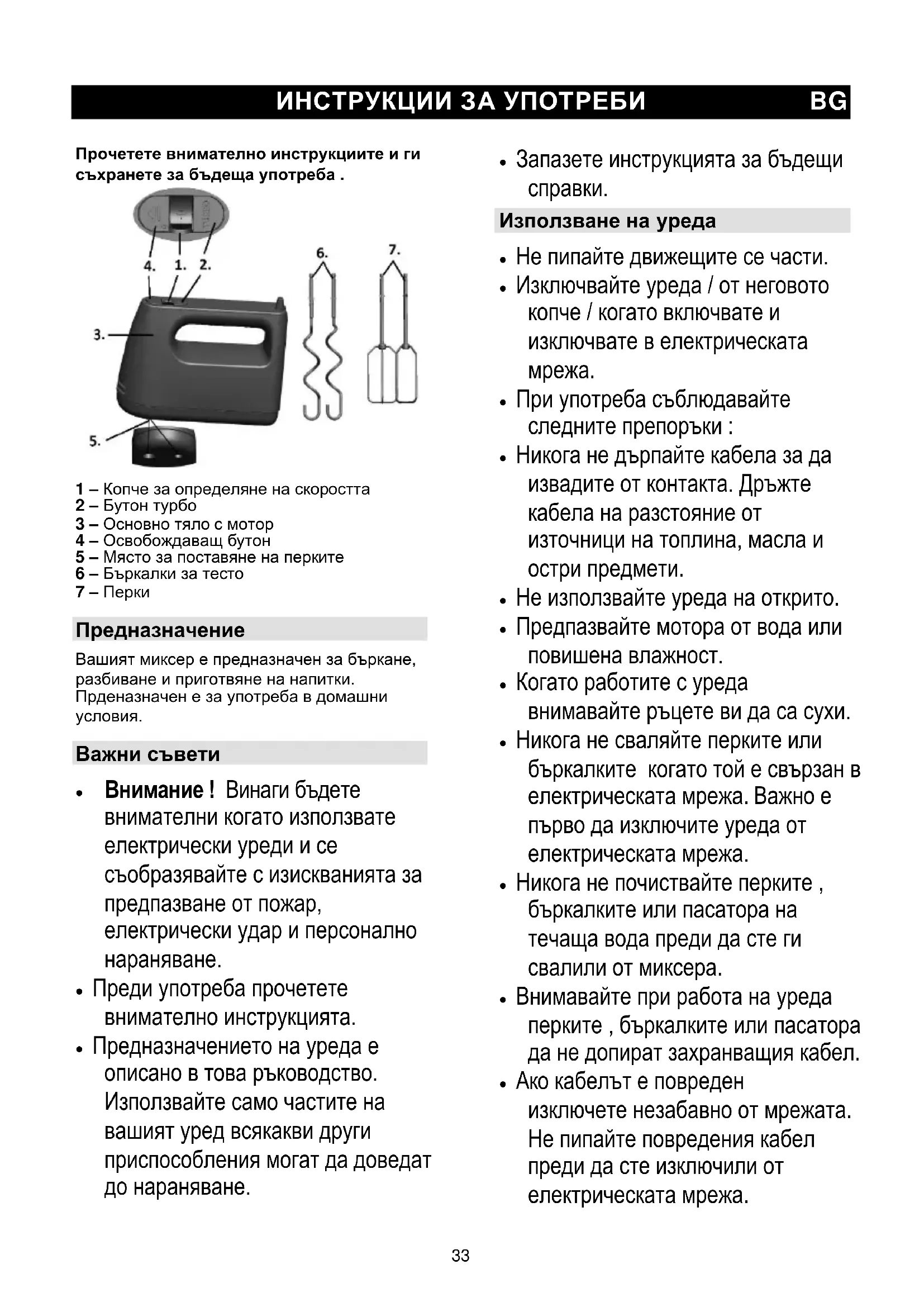 - Не използвайте уреда повече от 5 минути (с бъркалките) и 2 минути (с перките за тесто) ! След работа оставете миксера да не работи поне 10 минути след което може да го използвате отново.35