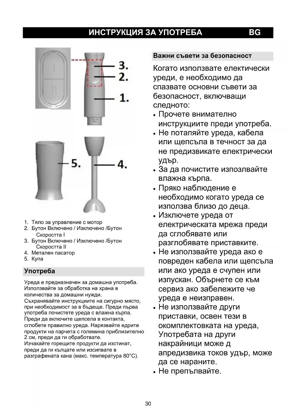 - Хванете и двете блендера и купата. За да се предпазите от пръскане първо потопете пасатора в купата и след това натиснете бутона Включена / Изключено. (2,3). Внимание! Когато приключите първо изключете уреда и тогава извадете пасатора от
