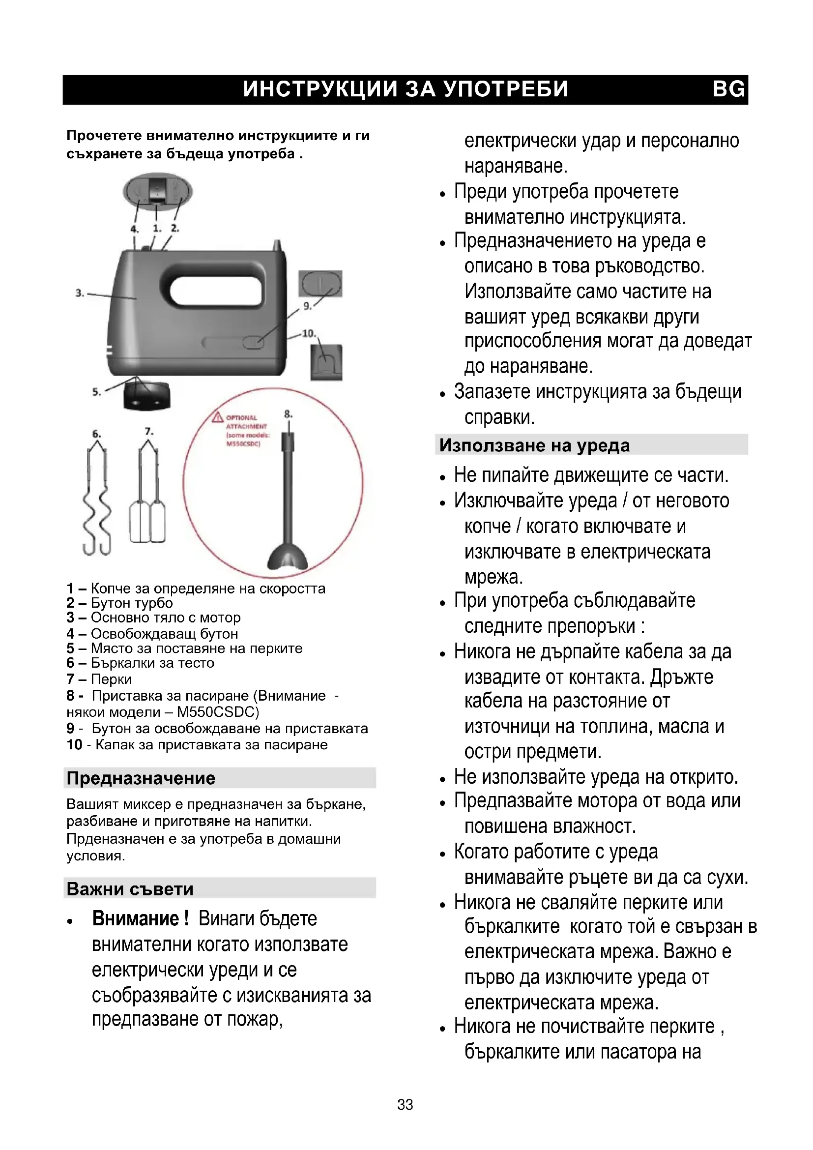 Vyhrazujeme si právo na jakékoliv úpravy!33 ИНСТРУКЦИИ ЗА УПОТРЕБИ BG Прочетете внимателно инструкциите и ги съхранете за бъдеща употреба . 1 – Копче за определяне на скоростта 2 – Бутон турбо 3 – Основно тяло с мотор 4 – Освобождаващ бутон 5 – Място за поставяне на перките 6 – Бъркалки за тесто 7 – Перки