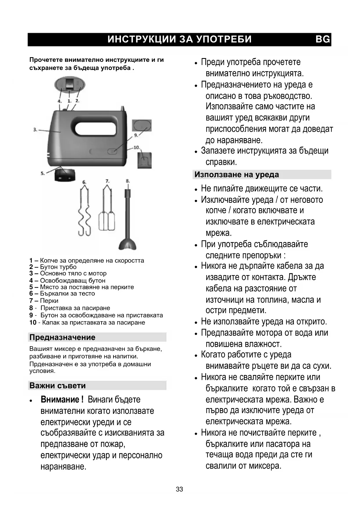 - Предназначението на уреда е описано в това ръководство. Използвайте само частите на вашият уред всякакви други приспособления могат да доведат до нараняване.