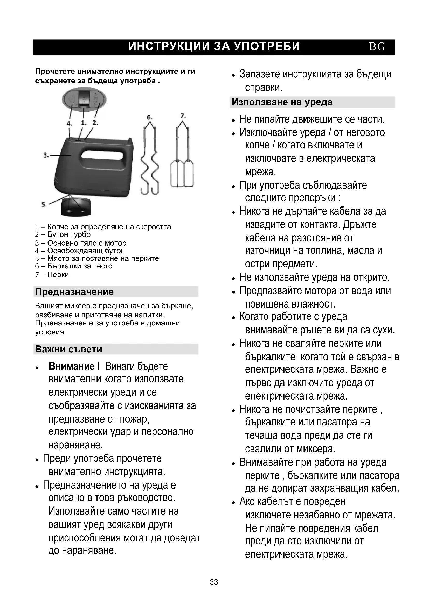- Не използвайте уреда повече от 5 минути (с бъркалките) и 2 минути (с перките за тесто) ! След работа оставете миксера да не работи поне 10 минути след което може да го използвате отново.35