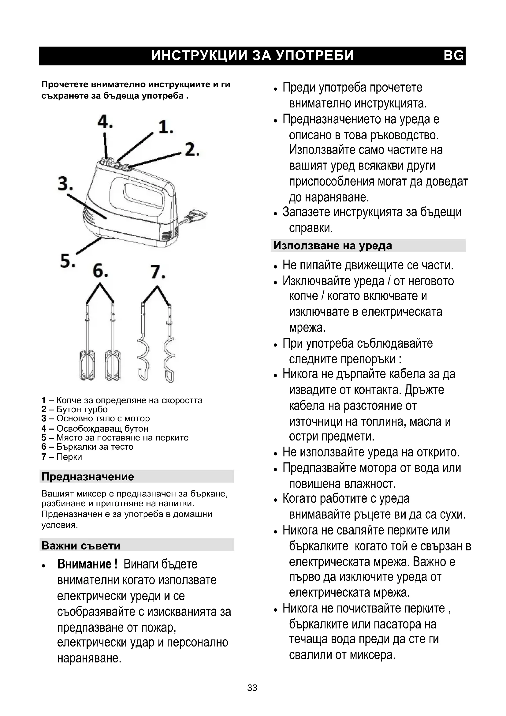 Vyhrazujeme si právo na jakékoliv úpravy!33 ИНСТРУКЦИИ ЗА УПОТРЕБИ BG Прочетете внимателно инструкциите и ги съхранете за бъдеща употреба . 1 – Копче за определяне на скоростта 2 – Бутон турбо 3 – Основно тяло с мотор 4 – Освобождаващ бутон 5 – Място за поставяне на перките 6 – Бъркалки за тесто 7 – Перки Предназначение Вашият миксер е предназначен за бъркане, разбиване и приготвяне на напитки. Прденазначен е за употреба в домашни
