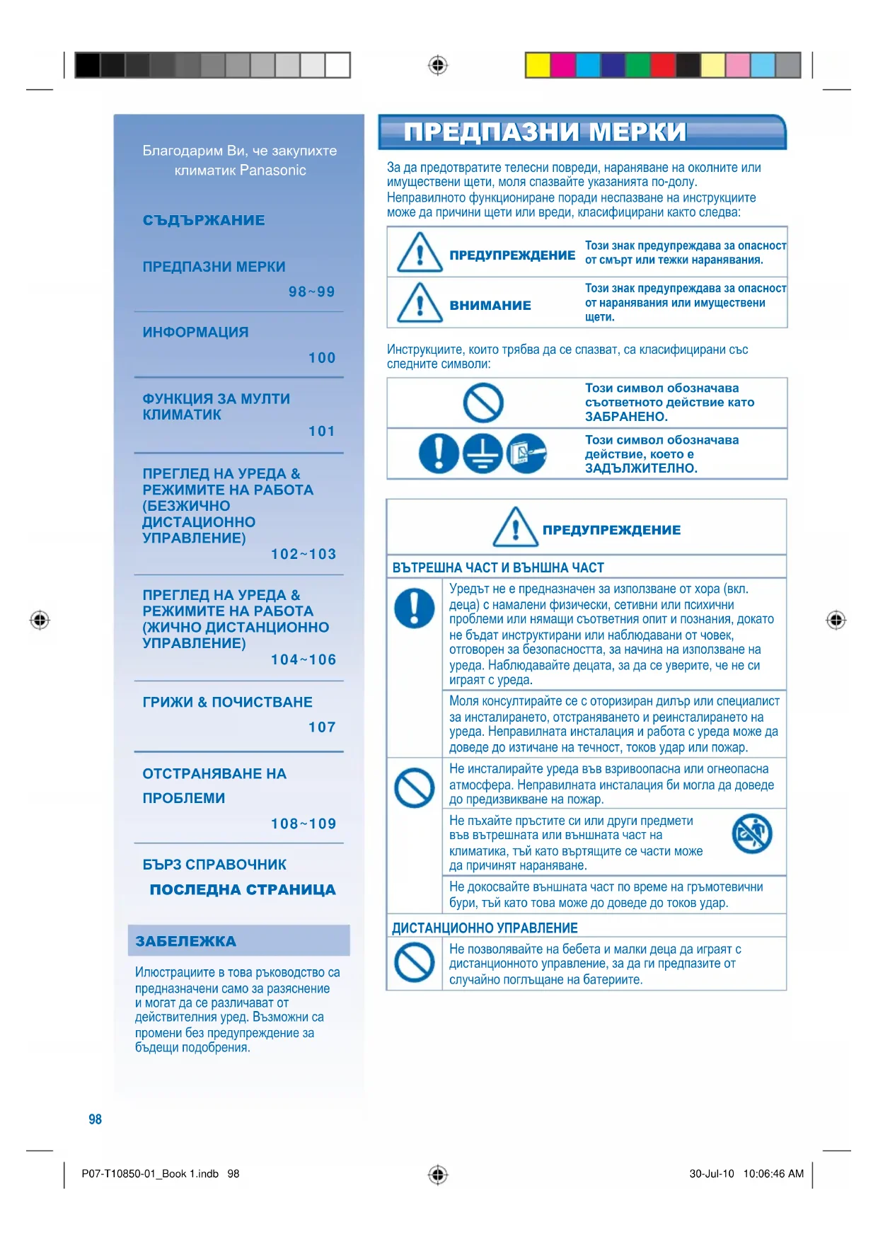 - Αφαιρέστε τις μπαταρίες από το τηλεχειριστήριο. (ασύρματο τηλεχειριστήριο). P07-T10850-01_Book 1.indb 97P07-T10850-01_Book 1.indb 97 30-Jul-10 10:06:46 AM30-Jul-10 10:06:46 AM98 За да предотвратите телесни повреди, нараняване на околните или имуществени щети, моля спазвайте указанията по-долу. Неправилното функциониране поради неспазване на инструкциите може да причини щети или вреди, класифицирани както следва: ПРЕДУПРЕЖДЕНИЕ ПРЕДУПРЕЖДЕНИЕ Този знак предупреждава за опасност от смърт или тежки наранявания.