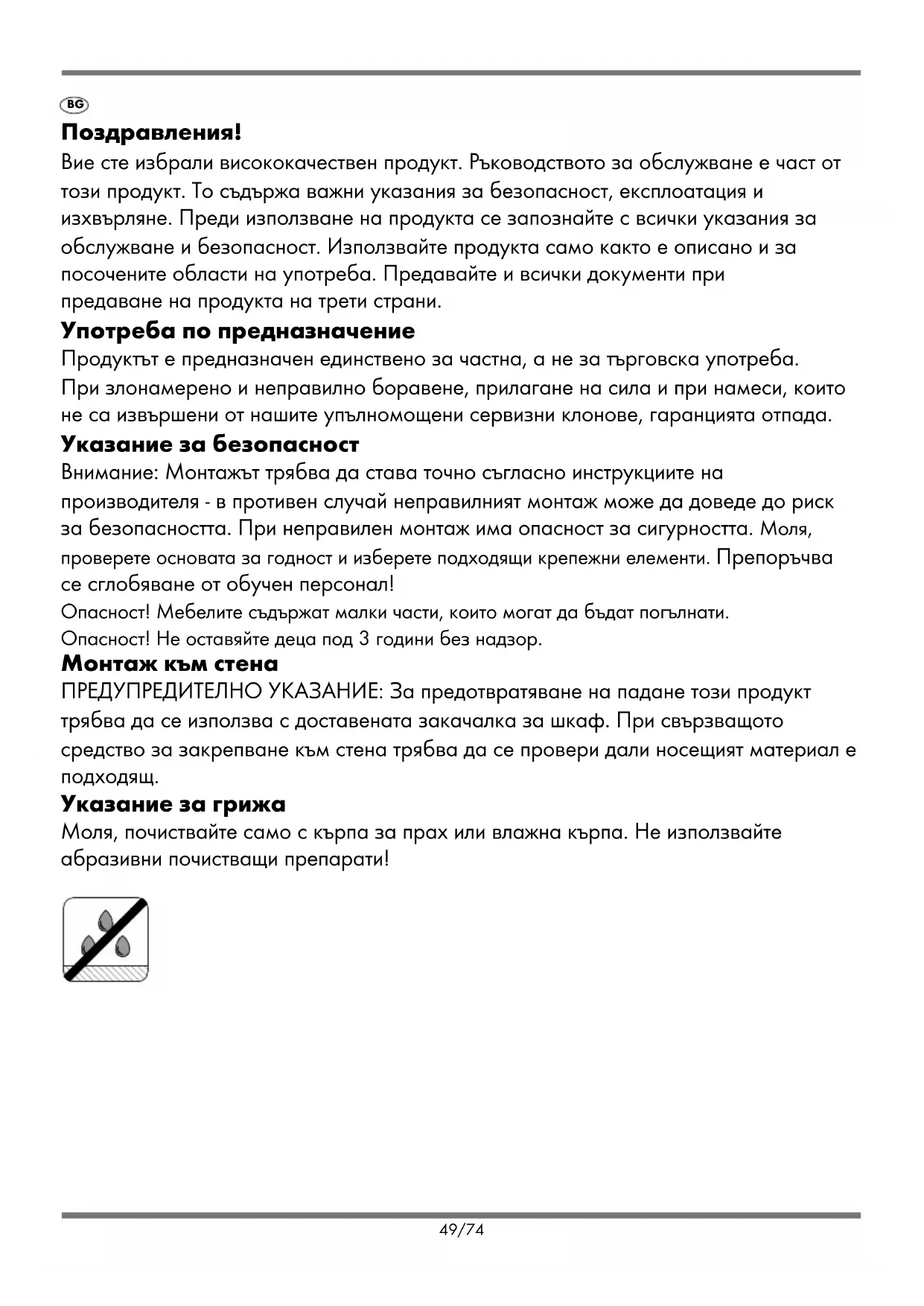 teći ponovno samo za taj dio. Odlaganje Molimo Vas da pakiranje i proizvod nakon uporabe odložite na ekološki prihvatljiv način. 48/74BG Поздравления! Вие сте избрали висококачествен продукт. Ръководството за обслужване е част от този продукт. То съдържа важни указания за безопасност, експлоатация и изхвърляне. Преди използване на продукта се запознайте с всички указания за обслужване и безопасност. Използвайте продукта само както е описано и за посочените области на употреба. Предавайте и всички документи при предаване на продукта на трети страни. Употреба по предназначение Продуктът е предназначен единствено за частна, а не за търговска употреба. При злонамерено и неправилно боравене, прилагане на сила и при намеси, които не са извършени от нашите упълномощени сервизни клонове, гаранцията отпада. Указание за безопасност Внимание: Монтажът трябва да става точно съгласно инструкциите на производителя - в противен случай неправилният монтаж може да доведе до риск за безопасността. При неправилен монтаж има опасност за сигурността. Моля, проверете основата за годност и изберете подходящи крепежни елементи. Препоръчва се сглобяване от обучен персонал! Опасност! Мебелите съдържат малки части, които могат да бъдат погълнати. Опасност! Не оставяйте деца под 3 години без надзор. Монтаж към стена ПРЕДУПРЕДИТЕЛНО УКАЗАНИЕ: За предотвратяване на падане този продукт трябва да се използва с доставената закачалка за шкаф. При свързващото средство за закрепване към стена трябва да се провери дали носещият материал е