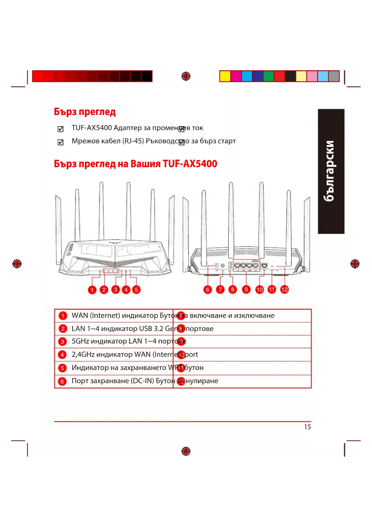 Бърз преглед на Вашия TUF-AX5400 Бърз преглед на Вашия TUF-AX5400 Бърз преглед Бърз преглед TUF-AX5400 Адаптер за променлив ток Мрежов кабел (RJ-45) Ръководство за бърз старт WAN (Internet) индикатор Бутон за включване и изключване LAN 1~4 индикатор USB 3.2 Gen 1 портове 5GHz индикатор LAN 1~4 портове 2,4GHz индикатор WAN (Internet) port Индикатор на захранването WPS бутон Порт захранване (DC-IN) Бутон за нулиране