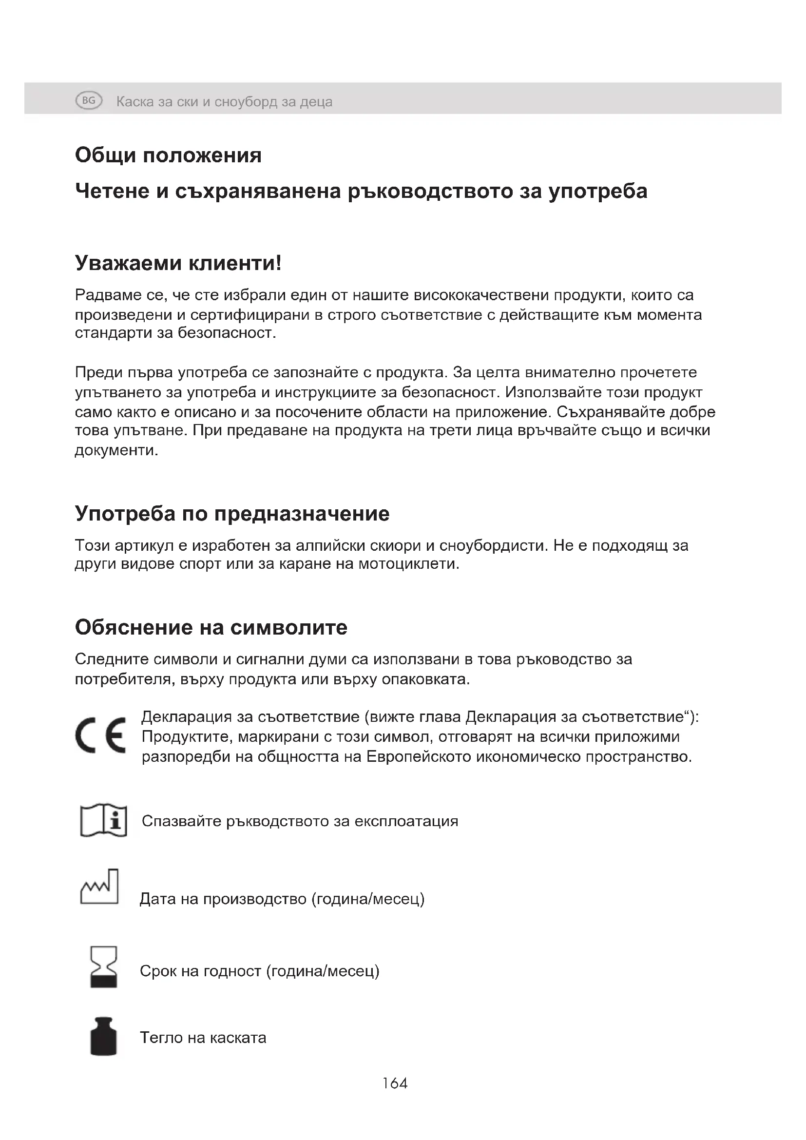 Употреба по предназначение Този артикул е изработен за алпийски скиори и сноубордисти. Не е подходящ за други видове спорт или за каране на мотоциклети. Обяснение на символите Следните символи и сигнални думи са използвани в това ръководство за потребителя, върху продукта или върху опаковката. Декларация за съответствие (вижте глава Декларация за съответствие“): Продуктите, маркирани с този символ, отговарят на всички приложими разпоредби на общността на Европейското икономическо пространство. Спазвайте ръкводството за експлоатация Дата на производство (година/месец) Срок на годност (година/месец) Тегло на каскатаКаска за ски и сноуборд за деца