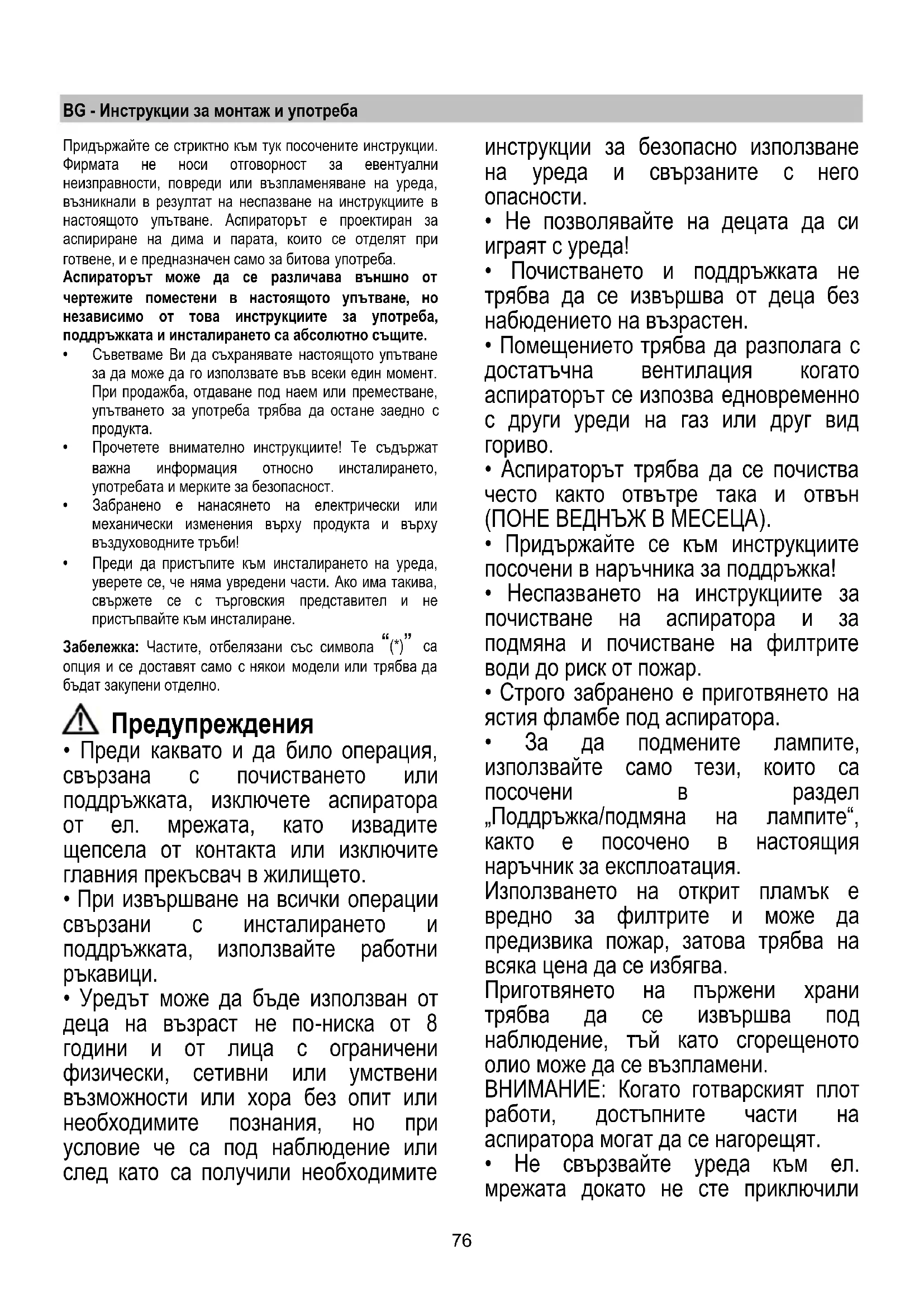 - Не използвайте и не оставяйте аспиратора без правилно монтирани лампички поради евентуален риск от токов