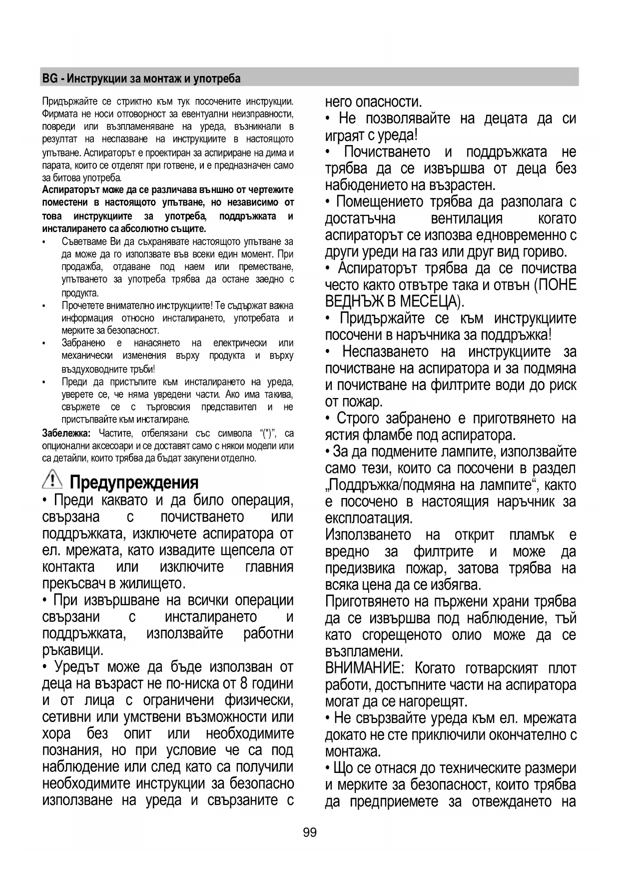 - Аспираторът не трябва НИКОГА да се използва като опорен плот освен ако това не е специално указано.