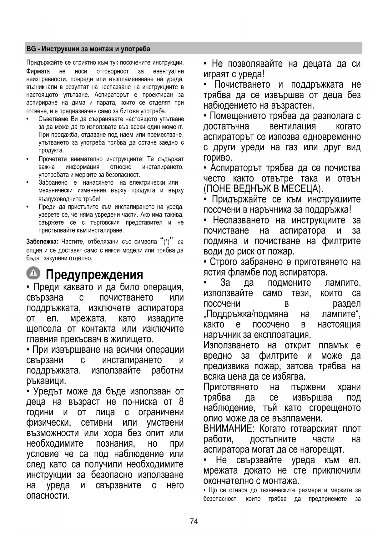 - Аспираторът не трябва НИКОГА да се използва като опорен плот освен ако това не е специално указано.