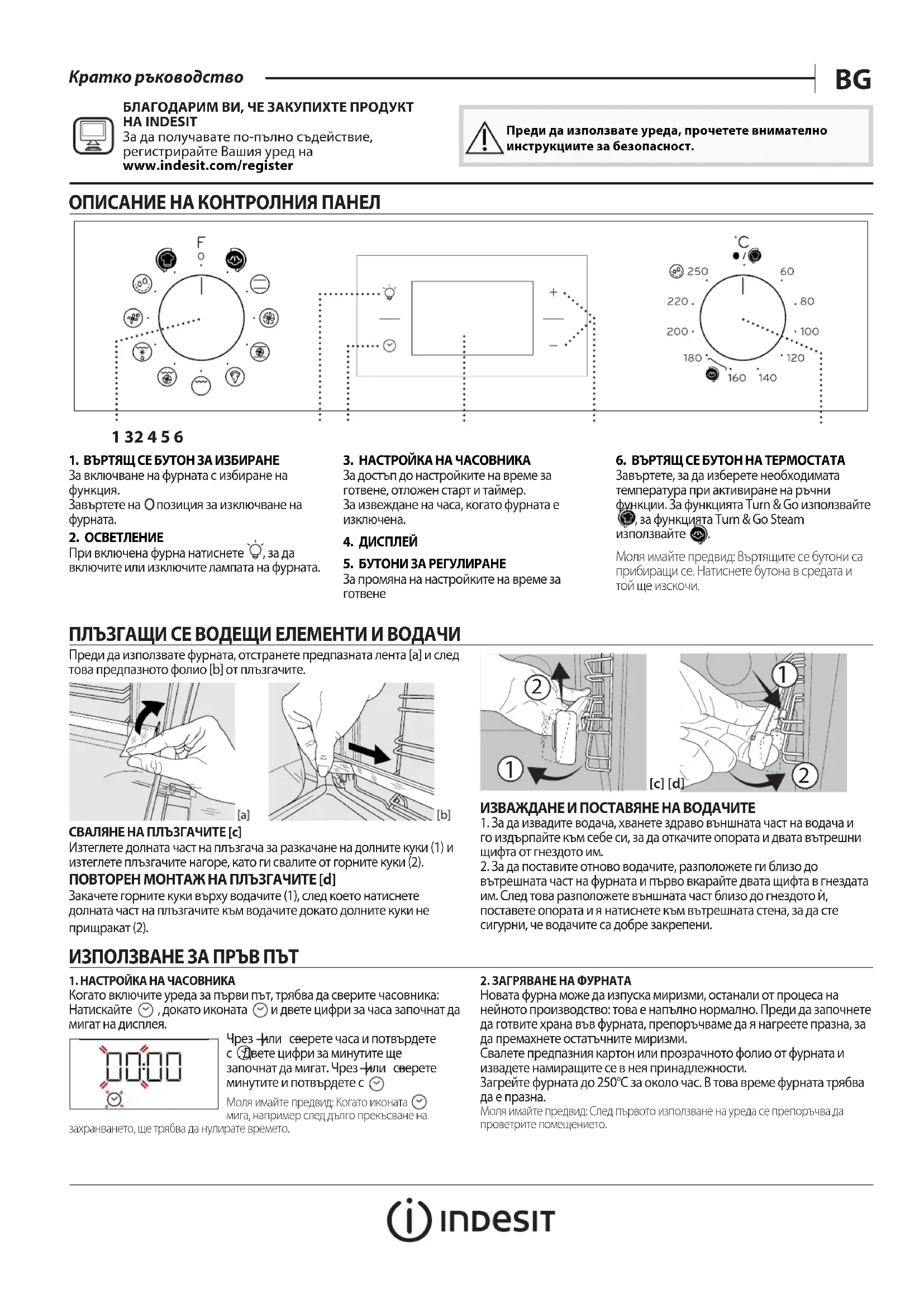 [c] [d]ИЗВАЖДАНЕ И ПОСТАВЯНЕ НА ВОДАЧИТЕ1. За да извадите водача, хванете здраво външната част на водача и го издърпайте към себе си, за да откачите опората и двата вътрешнищифта от гнездото им.2. За да поставите отново водачите, разположете ги близо до вътрешната част на фурната и първо вкарайте двата щифта в гнездатаим. След това разположете външната част близо до гнездото ѝ, поставете опората и я натиснете към вътрешната стена, за да сте сигурни, че водачите са добре закрепени.ИЗПОЛЗВАНЕ ЗА ПРЪВ ПЪТ1. НАСТРОЙКА НА ЧАСОВНИКАКогато включите уреда за първи път, трябва да сверите часовника: Натискайте , докато иконата и двете цифри за часа започнат да мигат на дисплея.Чрез или сверете часа и потвърдете с . Двете цифри за минутите ще започнат да мигат. Чрез или сверете минутите и потвърдете с .Моля имайте предвид: Когато иконата мига, например след дълго прекъсване на захранването, ще трябва да нулирате времето.2. ЗАГРЯВАНЕ НА ФУРНАТАНовата фурна може да изпуска миризми, останали от процеса на нейното производство: това е напълно нормално. Преди да започнетеда готвите храна във фурната, препоръчваме да я нагреете празна, за да премахнете остатъчните миризми.Свалете предпазния картон или прозрачното фолио от фурната и извадете намиращите се в нея принадлежности.Загрейте фурната до 250°C за около час. В това време фурната трябва да е празна.Моля имайте предвид: След първото използване на уреда се препоръчва да проветрите помещението.ОПИСАНИЕ НА КОНТРОЛНИЯ ПАНЕЛ1 32 4 5 61. ВЪРТЯЩ СЕ БУТОН ЗА ИЗБИРАНЕЗа включване на фурната с избиране на функция.Завъртете на позиция за изключване на фурната.2. ОСВЕТЛЕНИЕПри включена фурна натиснете , за давключите или изключите лампата на фурната.3. НАСТРОЙКА НА ЧАСОВНИКАЗа достъп до настройките на време за готвене, отложен старт и таймер.За извеждане на часа, когато фурната е изключена.4. ДИСПЛЕЙ5. БУТОНИ ЗА РЕГУЛИРАНЕЗа промяна на настройките на време за готвене6. ВЪРТЯЩ СЕ БУТОН НА ТЕРМОСТАТАЗавъртете, за да изберете необходимата температура при активиране на ръчни функции. За функцията Turn & Go използвайте , за функцията Turn & Go Steam използвайте .Моля имайте предвид: Въртящите се бутони са прибиращи се. Натиснете бутона в средата и той ще изскочи.БЛАГОДАРИМ ВИ, ЧЕ ЗАКУПИХТЕ ПРОДУКТ НА INDESITЗа да получавате по-пълно съдействие, регистрирайте Вашия уред на www . indesit . com/ registerПреди да използвате уреда, прочетете внимателно инструкциите за безопасност.ФУНКЦИИ И ВСЕКИДНЕВНА УПОТРЕБА