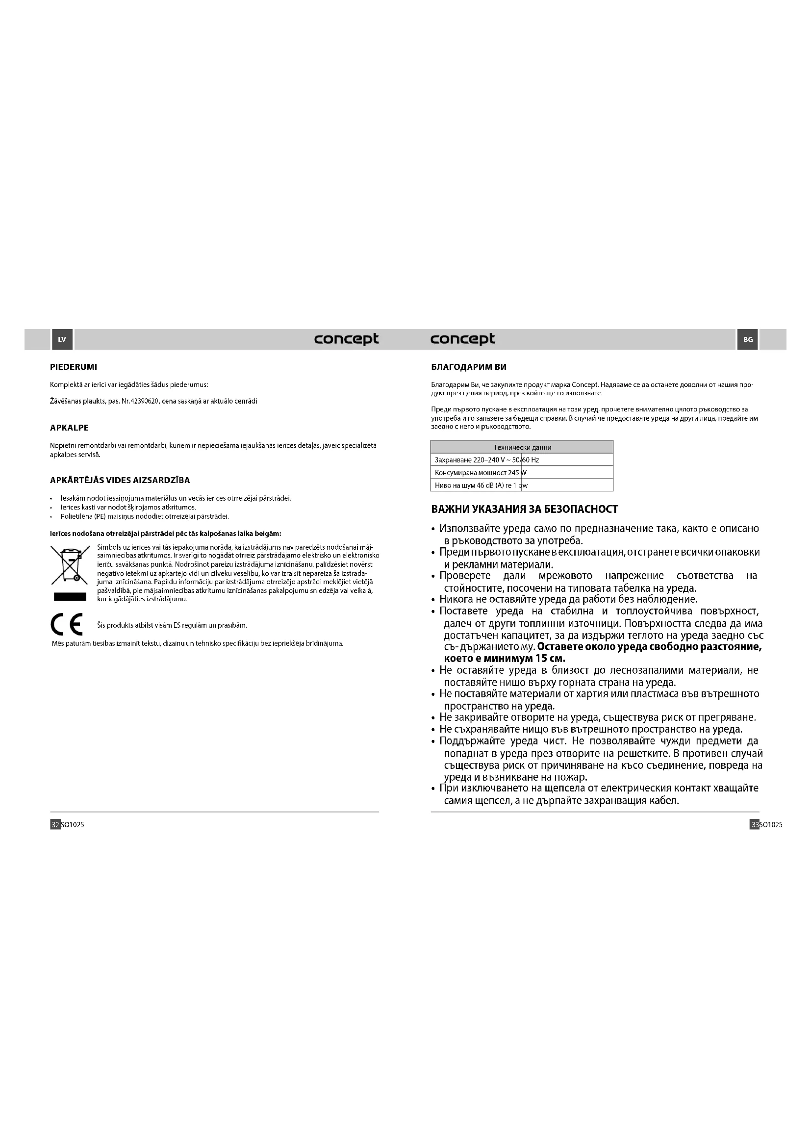 SO 1025 БЛАГОДАРИМ ВИ Благодарим Ви, че закупихте продукт марка Concept. Надяваме се да останете доволни от нашия про- дукт през целия период, през който ще го използвате. Преди първото пускане в експлоатация на този уред, прочетете внимателно цялото ръководство за употреба и го запазете за бъдещи справки. В случай че предоставяте уреда на други лица, предайте им заедно с него и ръководството. Технически данни Захранване 220–240 V ~ 50/60 Hz Консумирана мощност 245 W Ниво на шум 46 dB (A) re 1 pw ВАЖНИ УКАЗАНИЯ ЗА БЕЗОПАСНОСТ