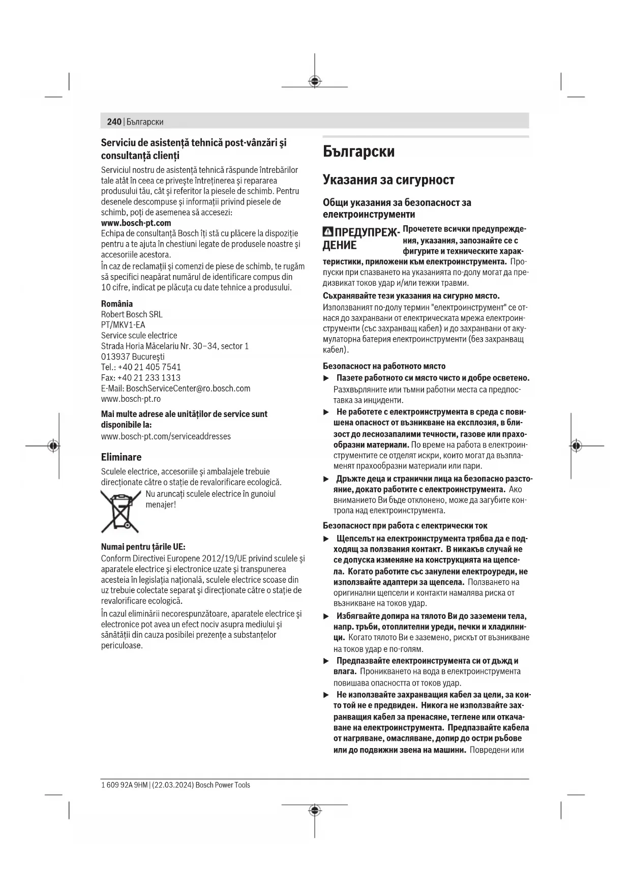 u Преди да извършвате каквито и да е дейности по електроинструмента, напр. настройване, смяна на работен инструмент, както и когато го прибирате, изключвайте щепсела от контакта, респ. изваждай- те батерията, ако е възможно. Тази мярка премахва опасността от задействане на електроинструмента по невнимание. u Съхранявайте електроинструментите на места, къ- дето не могат да бъдат достигнати от деца. Не до- пускайте те да бъдат използвани от лица, които не са запознати с начина на работа с тях и не са проче- ли тези инструкции. Когато са в ръцете на неопитни потребители, електроинструментите могат да бъдат из- ключително опасни. u Поддържайте добре електроинструментите си и ак- сесоарите им. Проверявайте дали подвижните зве- на функционират безукорно, дали не заклинват, да- ли има счупени или повредени детайли, които нару- шават или изменят функциите на електроинстру- мента. Преди да използвате електроинструмента, се погрижете повредените детайли да бъдат ремон- тирани. Много от трудовите злополуки се дължат на недобре поддържани електроинструменти и уреди. u Поддържайте режещите инструменти винаги добре заточени и чисти. Добре поддържаните режещи инст- рументи с остри ръбове оказват по‑малко съпротивле- ние и се водят по‑леко. u Използвайте електроинструментите, допълнител- ните приспособления, работните инструменти и т. н., съобразно инструкциите на производителя. При това се съобразявайте и с конкретните работни ус- ловия и операции, които трябва да изпълните. Из- ползването на електроинструменти за различни от предвидените от производителя приложения повиша- ва опасността от възникване на трудови злополуки. Bosch Power Tools 1 609 92A 9HM | (22.03.2024)242 | Български u Поддържайте дръжките и ръкохватките сухи, чисти и неомаслени. Хлъзгавите дръжки и ръкохватки не позволяват безопасната работа и доброто контролира- не на електроинструмента при възникване на неочак- вана ситуация.