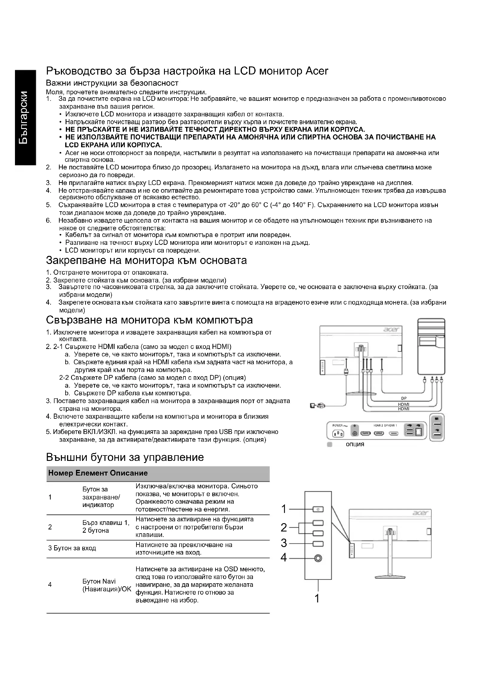 избрани модели) 4. Закрепете основата към стойката като завъртите винта с помощта на вграденото езиче или с подходяща монета. (за избрани Свързване на монитора към компютъра 1. Изключете монитора и извадете захранващия кабел на компютъра от контакта.2. 2-1 Свържете HDMI кабела (само за модел с вход HDMI)a. Уверете се, че както мониторът, така и компютърът са изключени.b. Свържете единия край на HDMI кабела към задната част на монитора, а другия край към порта на компютъра.2-2 Свържете DP кабела (само за модел с вход DP) (опция)a. Уверете се, че както мониторът, така и компютърът са изключени.b. Свържете DP кабела към компютъра.3. Поставете захранващия кабел на монитора в захранващия порт от задната страна на монитора.4. Включете захранващите кабели на компютъра и монитора в близкия електрически контакт. 5. Изберете ВКЛ./ИЗКЛ. на функцията за зареждане през USB при изключено захранване, за да активирате/деактивирате тази функция. (опция) Външни бутони за управление Номер Елемент Описание