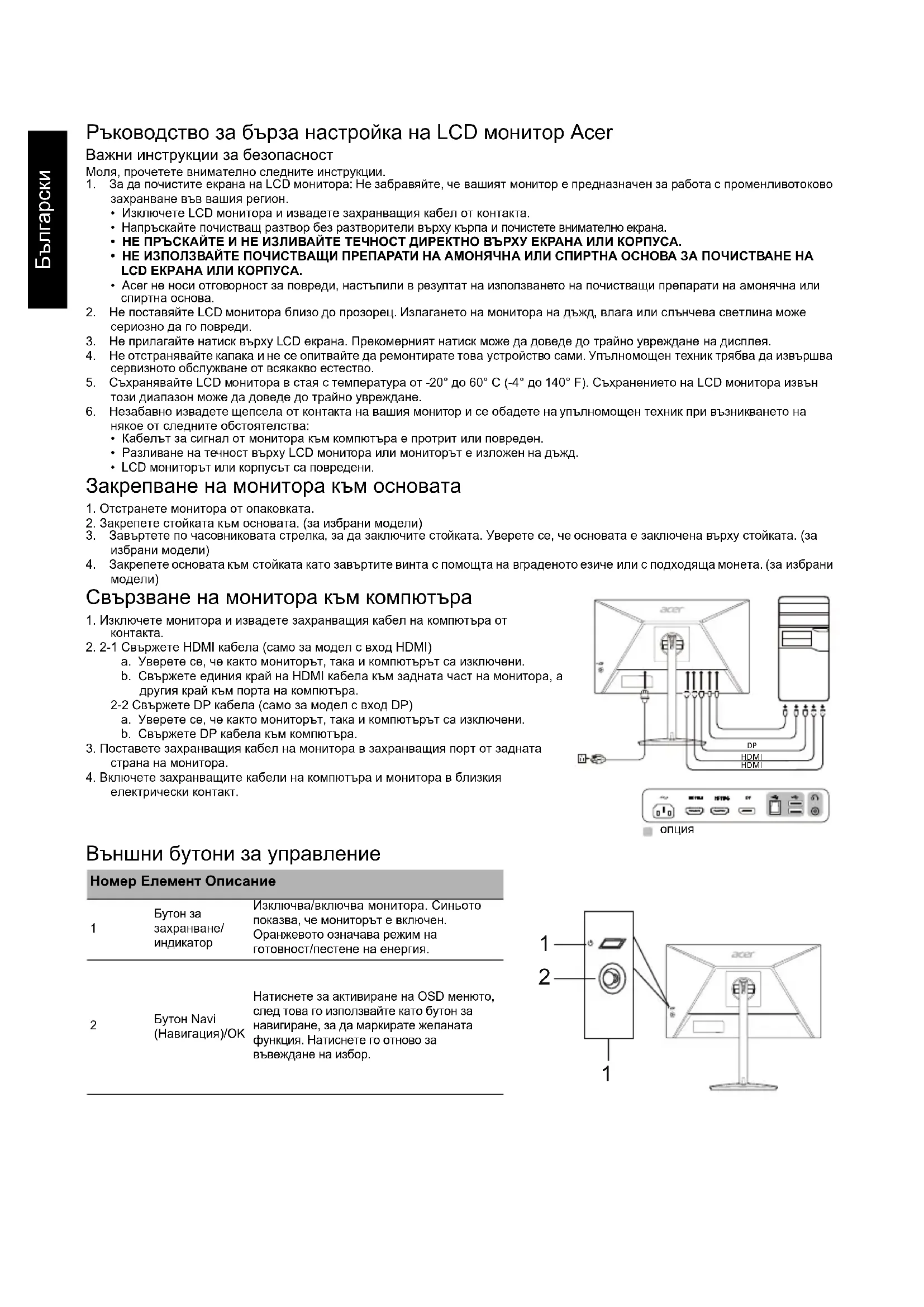 избрани модели) 4. Закрепете основата към стойката като завъртите винта с помощта на вграденото езиче или с подходяща монета. (за избрани Свързване на монитора към компютъра 1. Изключете монитора и извадете захранващия кабел на компютъра от контакта.2. 2-1 Свържете HDMI кабела (само за модел с вход HDMI)a. Уверете се, че както мониторът, така и компютърът са изключени.b. Свържете единия край на HDMI кабела към задната част на монитора, а другия край към порта на компютъра.2-2 Свържете DP кабела (само за модел с вход DP)a. Уверете се, че както мониторът, така и компютърът са изключени.b. Свържете DP кабела към компютъра.3. Поставете захранващия кабел на монитора в захранващия порт от задната страна на монитора.4. Включете захранващите кабели на компютъра и монитора в близкия електрически контакт. Външни бутони за управление Номер Елемент Описание