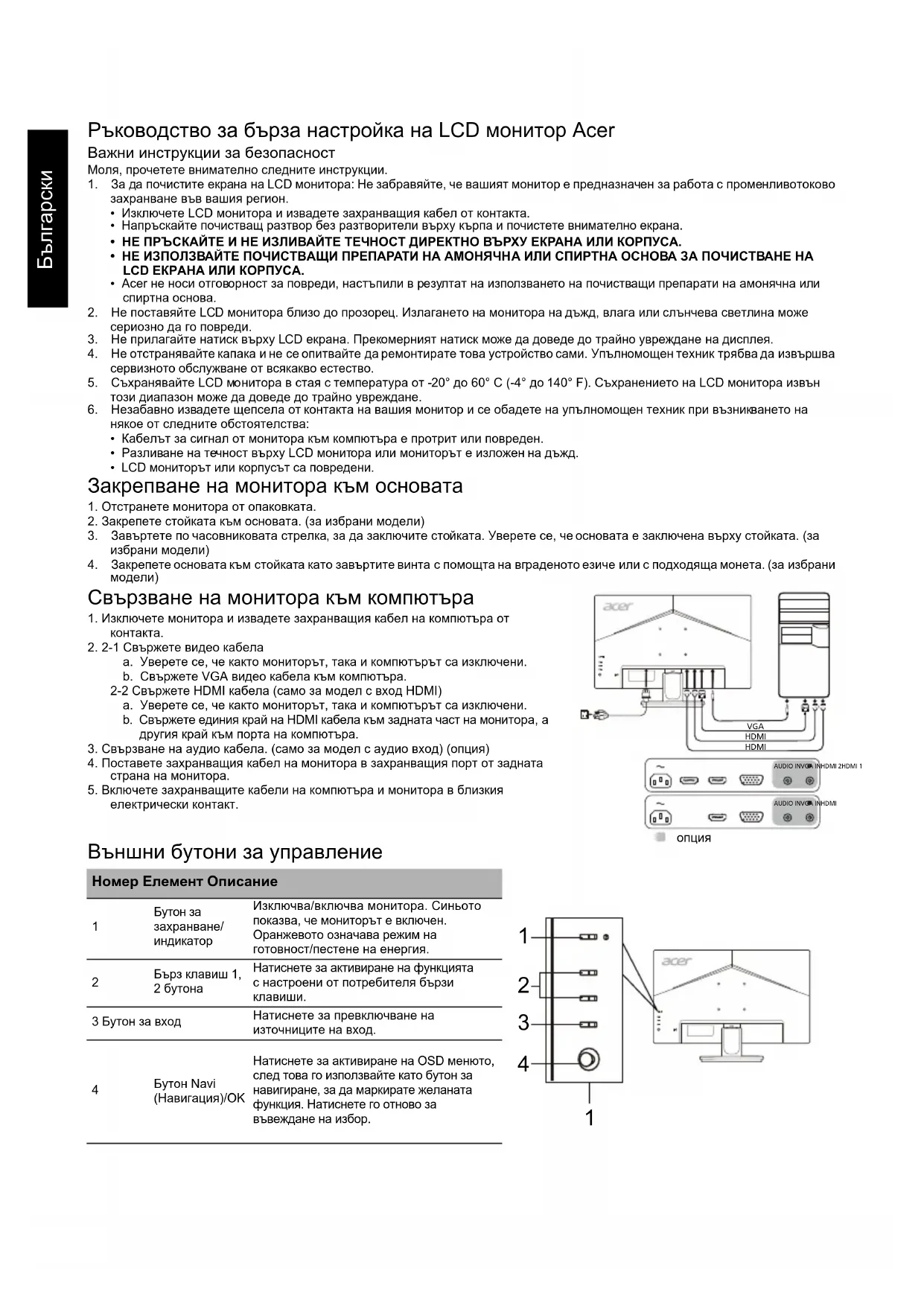 избрани модели) 4. Закрепете основата към стойката като завъртите винта с помощта на вграденото езиче или с подходяща монета. (за избрани Свързване на монитора към компютъра 1. Изключете монитора и извадете захранващия кабел на компютъра от контакта.2. 2-1 Свържете видео кабелаa. Уверете се, че както мониторът, така и компютърът са изключени.b. Свържете VGA видео кабела към компютъра. 2-2 Свържете HDMI кабела (само за модел с вход HDMI)a. Уверете се, че както мониторът, така и компютърът са изключени.b. Свържете единия край на HDMI кабела към задната част на монитора, а другия край към порта на компютъра.3. Свързване на аудио кабела. (само за модел с аудио вход) (опция)4. Поставете захранващия кабел на монитора в захранващия порт от задната страна на монитора.5. Включете захранващите кабели на компютъра и монитора в близкия електрически контакт. Външни бутони за управление Номер Елемент Описание