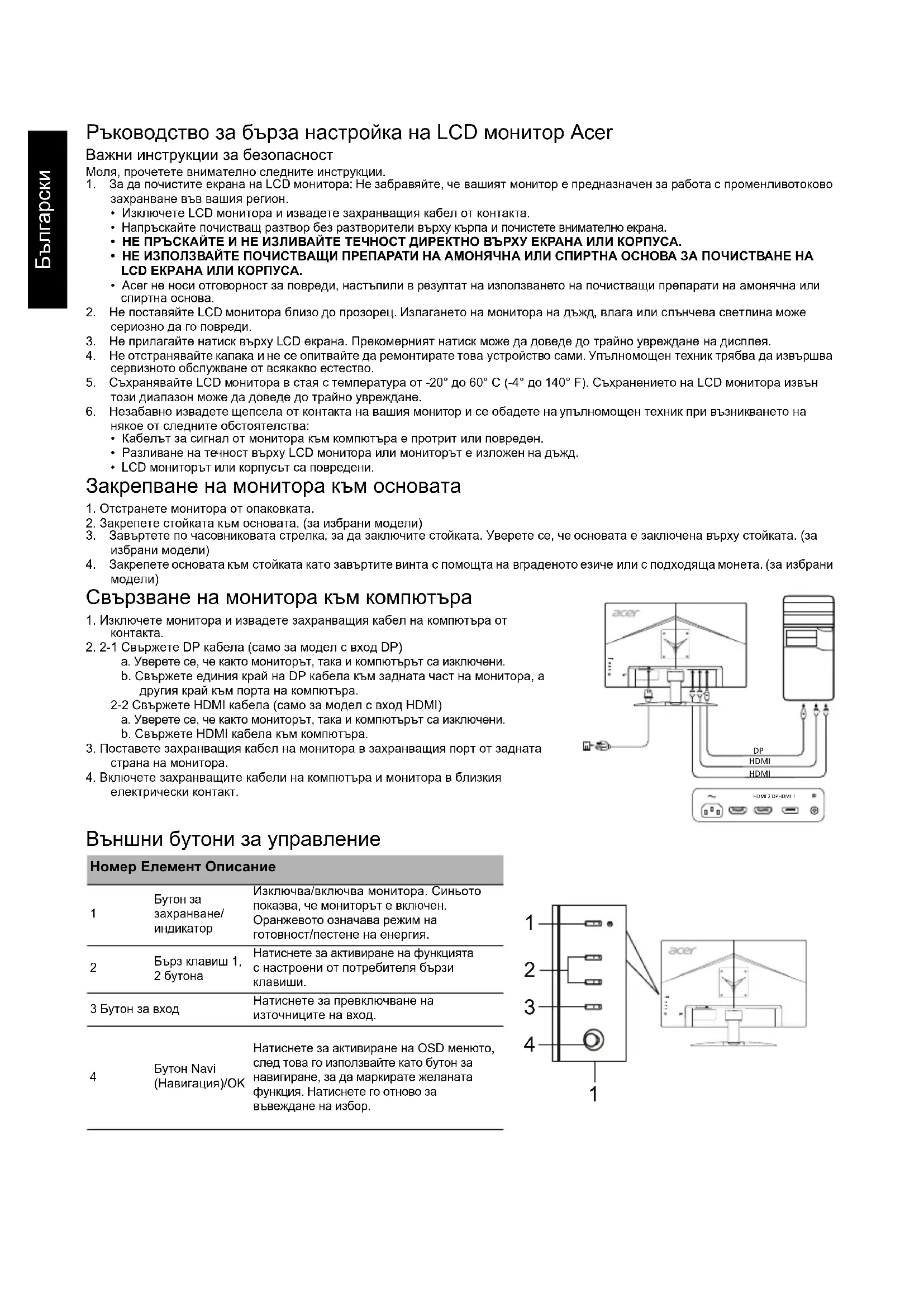 (tipic) Contrast 100.000.000:1 Max (ACM) Unghi de vizualizare 178° (H) 178° (V) (CR=10) Timp de răspuns 1 ms (VRB) Tip panou In-Plane Switching - IPS Frecvenţă orizontală HDMI: 30 - 112 KHz DP: 112 - 112 KHz Frecvenţă verticală HDMI: 56 - 76 Hz DP: 48 - 75 Hz Culori afişate 16,7 Milioane Frecvenţa de ceas 298,47 MHz Rezoluţie maximă 2560 x 1440 la 75 Hz Tip plug & play VESA DDCCI/DDC2B Putere absorbită (la 200 nits) Modul Pornit 24 W (tipic) Modul Repaus 0,35 W (tipic) Modul Oprit 0,3 W (tipic) Conector de intrare HDMI (numai la modelul cu intrare HDMI) DP (numai la modelul cu intrare DP) Semnal video de intrare HDMI (numai la modelul cu intrare HDMI) (opţional) DP (numai la modelul cu intrare DP) (opţional) Difuzoare 2 W x 2 (opţional) Dimensiune maximă ecran Orizontală: 596,74 mm Verticală: 335,66 mm Sursă de alimentare 100-240 V, 50/60 Hz Consideraţii privind mediul Temp. de funcţionare: 0 ° - 40 °C Temp. de depozitare: -20 ° - 60 °C Umiditate în timpul funcţionării: 20% - 80% Dimensiuni 614 (l) x 454,02 (h) x 231,08 (a) mm Masa (netă) 5,06 kg (net) Specificaţii privind mecanismul Înclinare: -5° - +15° Rotire: Nu Reglarea înălţimii: Nu Pivotare: Nu Suport cu picior detaşabil: Da Comenzi externe Comutator/butoane Buton de alimentare Tasta rapidă 1 Tasta rapidă 2 Intrare Meniu/Navi/OK Funcţii Luminozitate Contrast Lumină albastră Amplificare negru ACM Pornit/Oprit Claritate superioară Gamă Temperatură culoare Moduri sRGB Mod Tonuri de gri Nuanţe pe 6 axe Saturaţie pe 6 axe Volum Fără sunet Over Drive FreeSync VRB Punct de concentrare Limbă Expirare OSD Transparenţă Frecvenţă reîmprospătare Blocare OSD Intrare Sursă automată Format DP Atribuire tastă rapidă Mod lat DDC/CI Pornit/Oprit Nivel de negru HDMI Modul Pornire rapidă Informaţii monitor Resetare toate setările Ieşire Specificaţiile variază în funcţie de model şi/sau de regiune.Български Ръководство за бърза настройка на LCD монитор Acer Важни инструкции за безопасност Моля, прочетете внимателно следните инструкции.