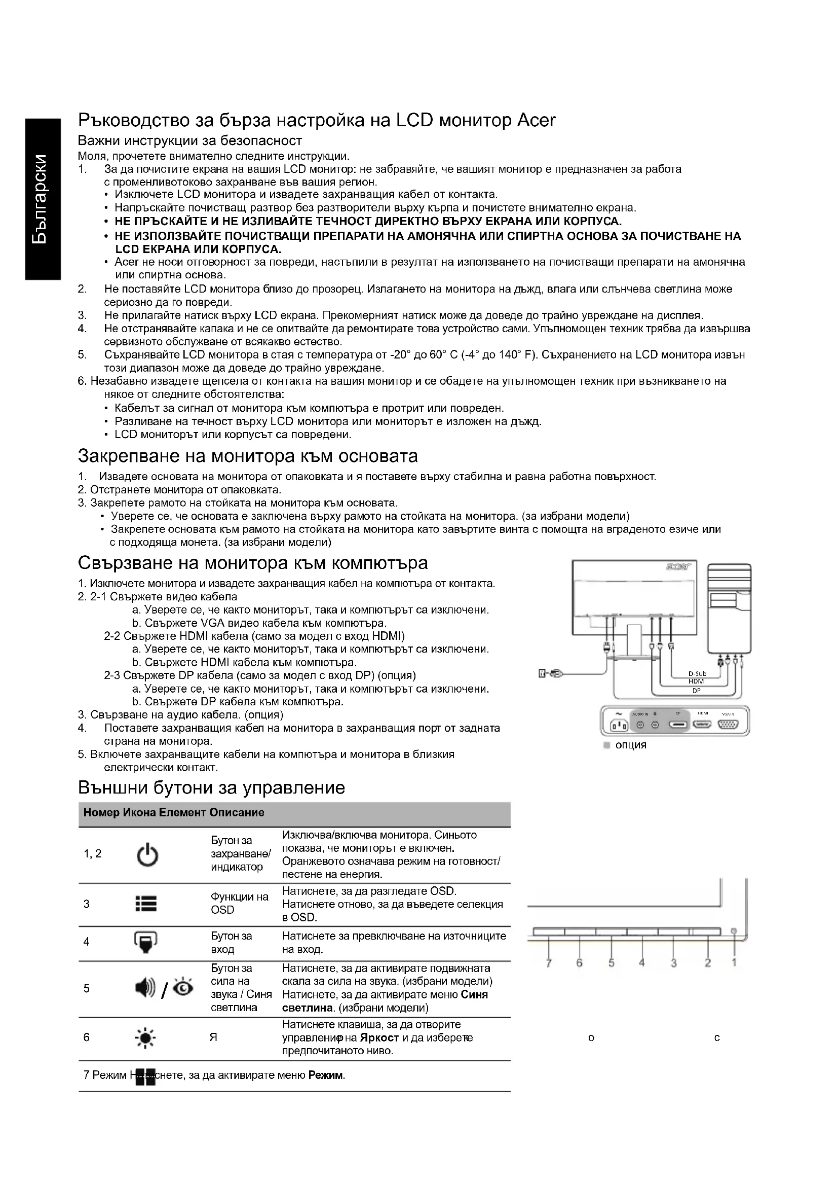 опцияБългарски Разпоредби и бележки за безопасност Бележка от Федералната комисия за комуникации (ФКК) Това устройство е тествано и отговаря на ограниченията за цифрово устройство от клас B, съгласно част 15 от правилата на ФКК. Тези ограничения са предназначени да осигуряват разумна защита срещу вредни смущения в жилищни инсталации. Това устройство генерира, използва и може да излъчва радиочестотна енергия и ако не бъде монтирано и използвано, в съответствие с инструкциите, може да причини вредни смущения на радио комуникациите. Въпреки това, няма гаранции, че няма да възникнат смущения в конкретна инсталация. Ако устройството причинява вредни смущения на радио и телевизионно приемане, което може да се установи чрез изключване и включване на устройството, потребителят се насърчава да се опита да коригира смущението чрез една от следните мерки: Преориентиране или преместване на антената на приемника. Увеличаване на разстоянието между устройството и приемника. Свързване на устройството в контакт във верига, която е различна от тази, в която е свързан приемникът. Консултация с доставчик или опитен радио/телевизионен техник за помощ. CE декларация за съответствие С настоящето, Acer Inc., декларира, че този LCD монитор е в съответствие със съществените изисквания и други приложими разпоредби на директивата за електромагнитна съвместимост (EMC) 2014/30/ЕC, директивата за ниско напрежение 2014/35/ЕC и RoHS директивата 2011/65/ЕC, и директива 2009/125/EО по отношение на създаването на рамка за определяне на изискванията за екодизайн за продукти, свързани с енергопотребление.