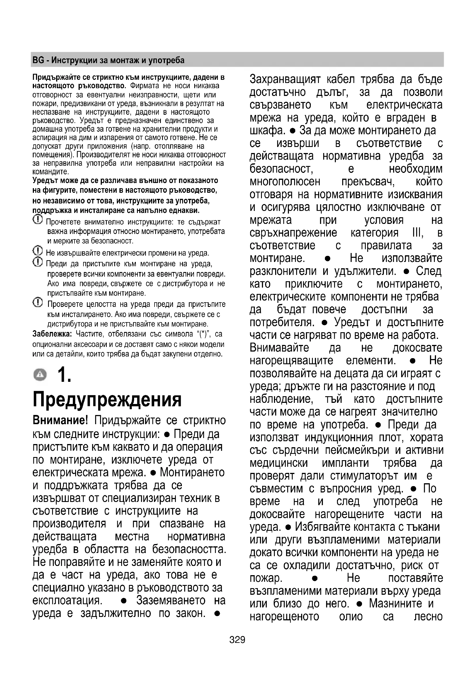 Ha a fenti ellenőrzés után a hibajelzés továbbra is fennmarad, vegye fel a kapcsolatot a legközelebbi műszaki szervizzel.329 BG - Инструкции за монтаж и употреба Придържайте се стриктно към инструкциите, дадени в настоящото ръководство. Фирмата не носи никаква отговорност за евентуални неизправности, щети или пожари, предизвикани от уреда, възникнали в резултат на неспазване на инструкциите, дадени в настоящото ръководство. Уредът е предназначен единствено за домашна употреба за готвене на хранителни продукти и аспирация на дим и изпарения от самото готвене. Не се допускат други приложения (напр. отопляване на помещения). Производителят не носи никаква отговорност за неправилна употреба или неправилни настройки на