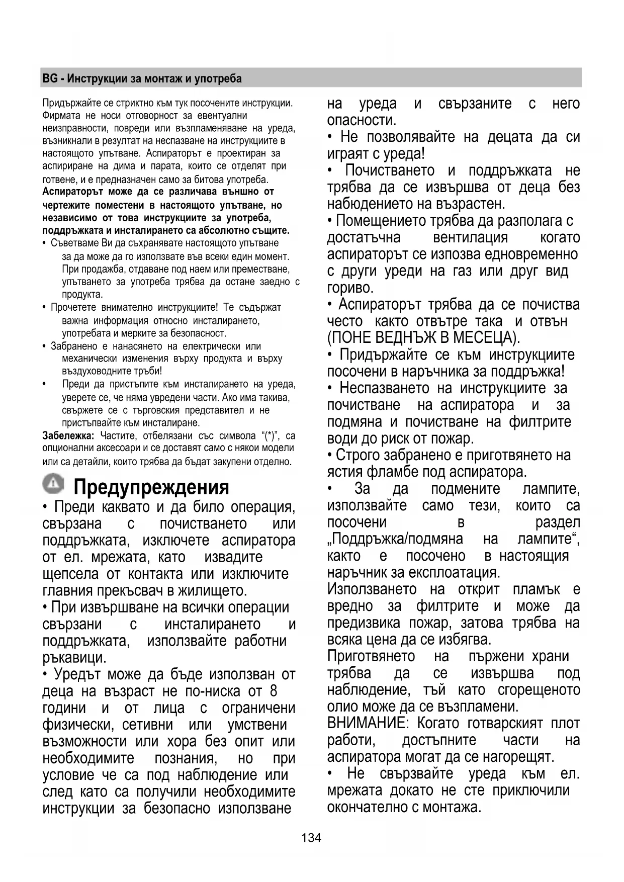 - Помещението трябва да разполага с достатъчна вентилация когато аспираторът се изпозва едновременно с други уреди на газ или друг вид