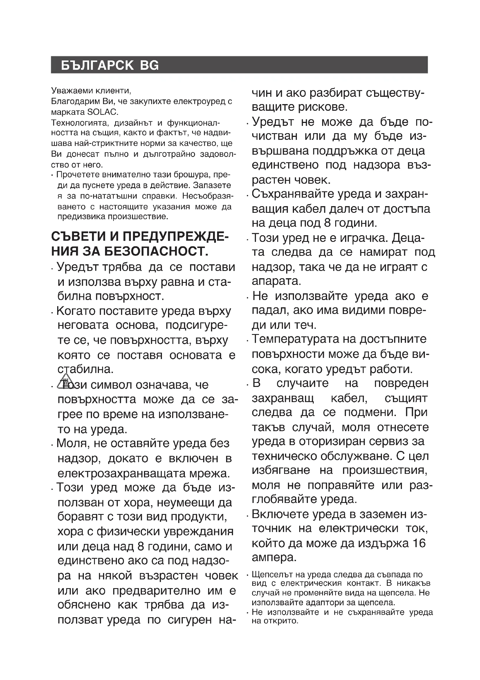 - Прочетете внимателно тази брошура, пре- ди да пуснете уреда в действие. Запазете я за по-нататъшни справки. Несъобразя- ването с настоящите указания може да предизвика произшествие. СЪВЕТИ И ПРЕДУПРЕЖДЕ- НИЯ ЗА БЕЗОПАСНОСТ.
