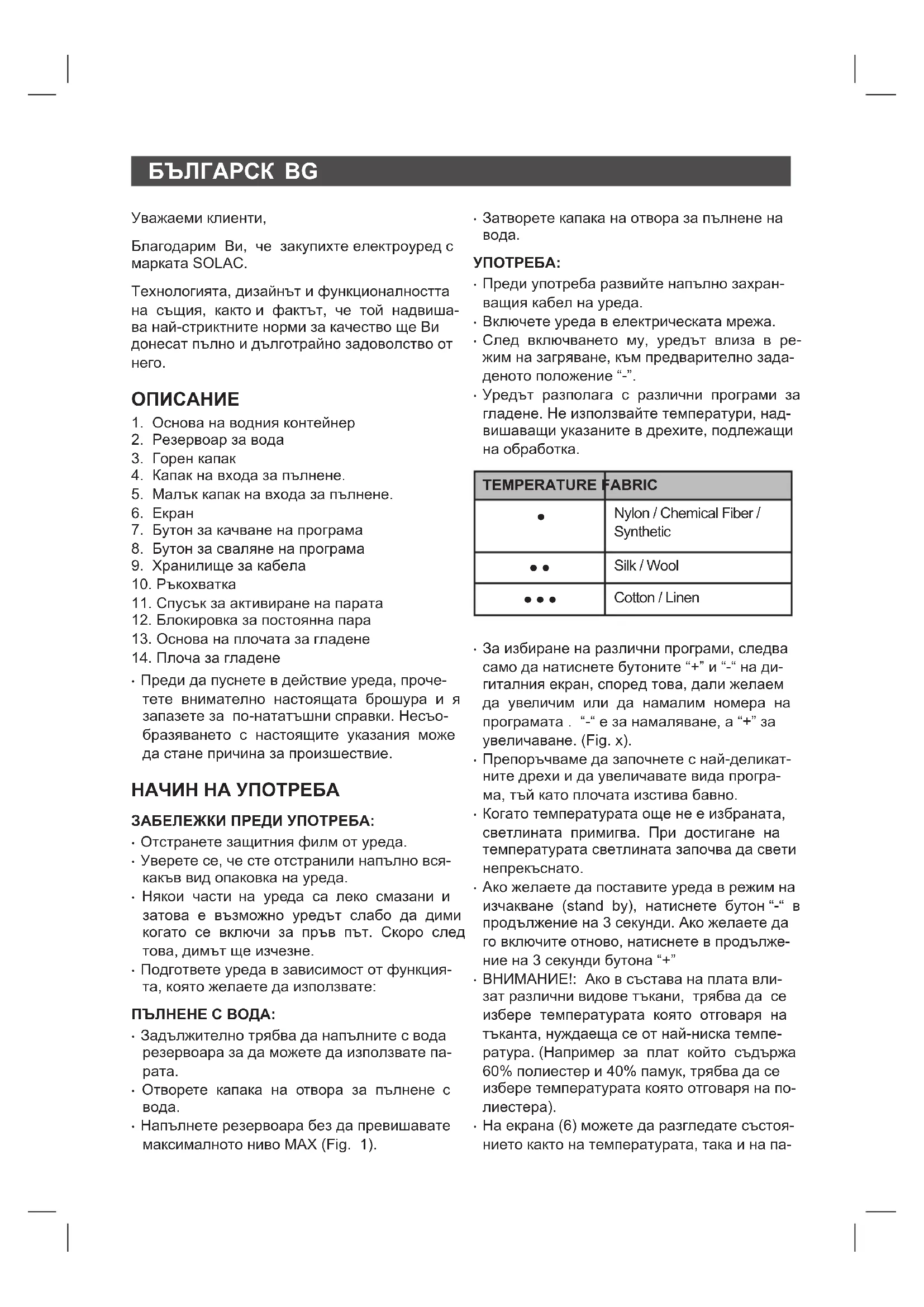 - Уредът разполага с различни програми за гладене. Не използвайте температури, над- вишаващи указаните в дрехите, подлежащи на обработка.
