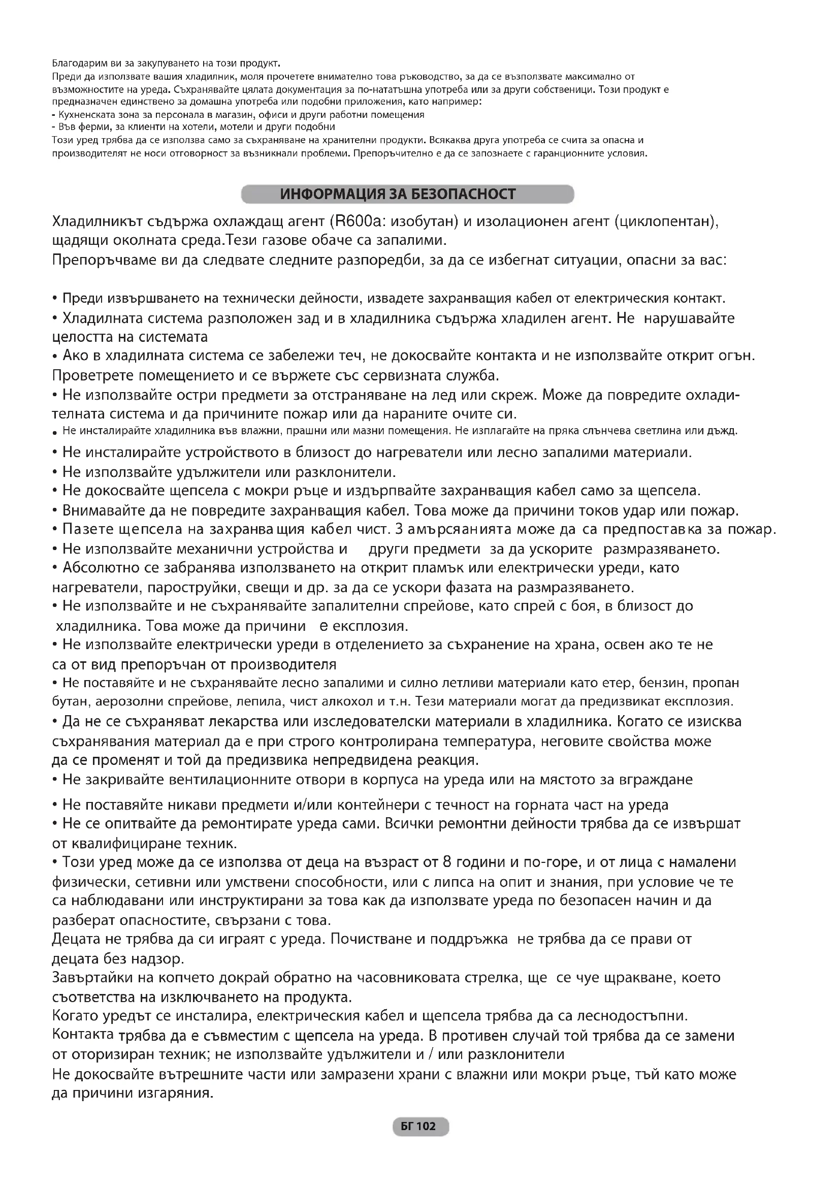 - --109 ОТСТРАНЯВАНЕ НА НЕИЗПРАВНОСТИ --110 РАЗМЕРИ НА ПРОДУКТА И НИШАТА ЗА ВГРАЖДАНЕБлагодарим ви за закупуването на този продукт. Преди да използвате вашия хладилник, моля прочетете внимателно това ръководство, за да се възползвате максимално от възможностите на уреда. Съхранявайте цялата документация за по-нататъшна употреба или за други собственици. Този продукт е предназначен единствено за домашна употреба или подобни приложения, като например: - Кухненската зона за персонала в магазин, офиси и други работни помещения - Във ферми, за клиенти на хотели, мотели и други подобни Този уред трябва да се използва само за съхраняване на хранителни продукти. Всякаква друга употреба се счита за опасна и производителят не носи отговорност за възникнали проблеми. Препоръчително е да се запознаете с гаранционните условия. Хладилникът съдържа охлаждащ агент (R600a: изобутан) и изолационен агент (циклопентан), щадящи околната среда.Тези газове обаче са запалими. Препоръчваме ви да следвате следните разпоредби, за да се избегнат ситуации, опасни за вас: p. 110