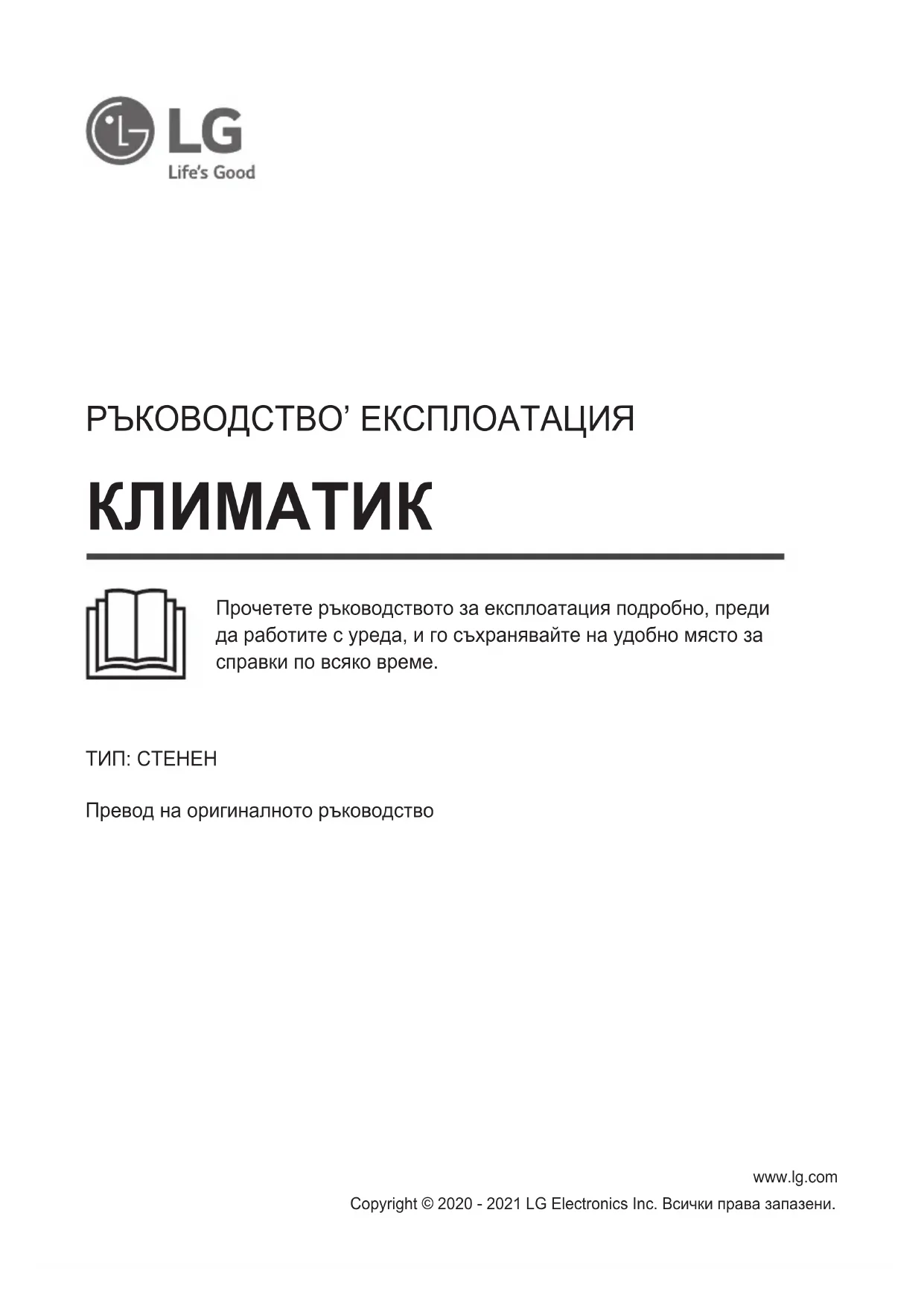 - Copyright © 2020 - 2021 LG Electronics Inc. Всички права запазени. ТИП: СТЕНЕН Превод на оригиналното ръководство РЪКОВОДСТВО’ ЕКСПЛОАТАЦИЯ Прочетете ръководството за експлоатация подробно, преди да работите с уреда, и го съхранявайте на удобно място за справки по всяко време.СЪДЪРЖАНИЕ Това ръководство може да съдържа изображения или съдържание, различно от модела, който сте закупили. Ръководството подлежи на редакция от производителя. ИНСТРУКЦИИ ЗА БЕЗОПАСНОСТ p. 3