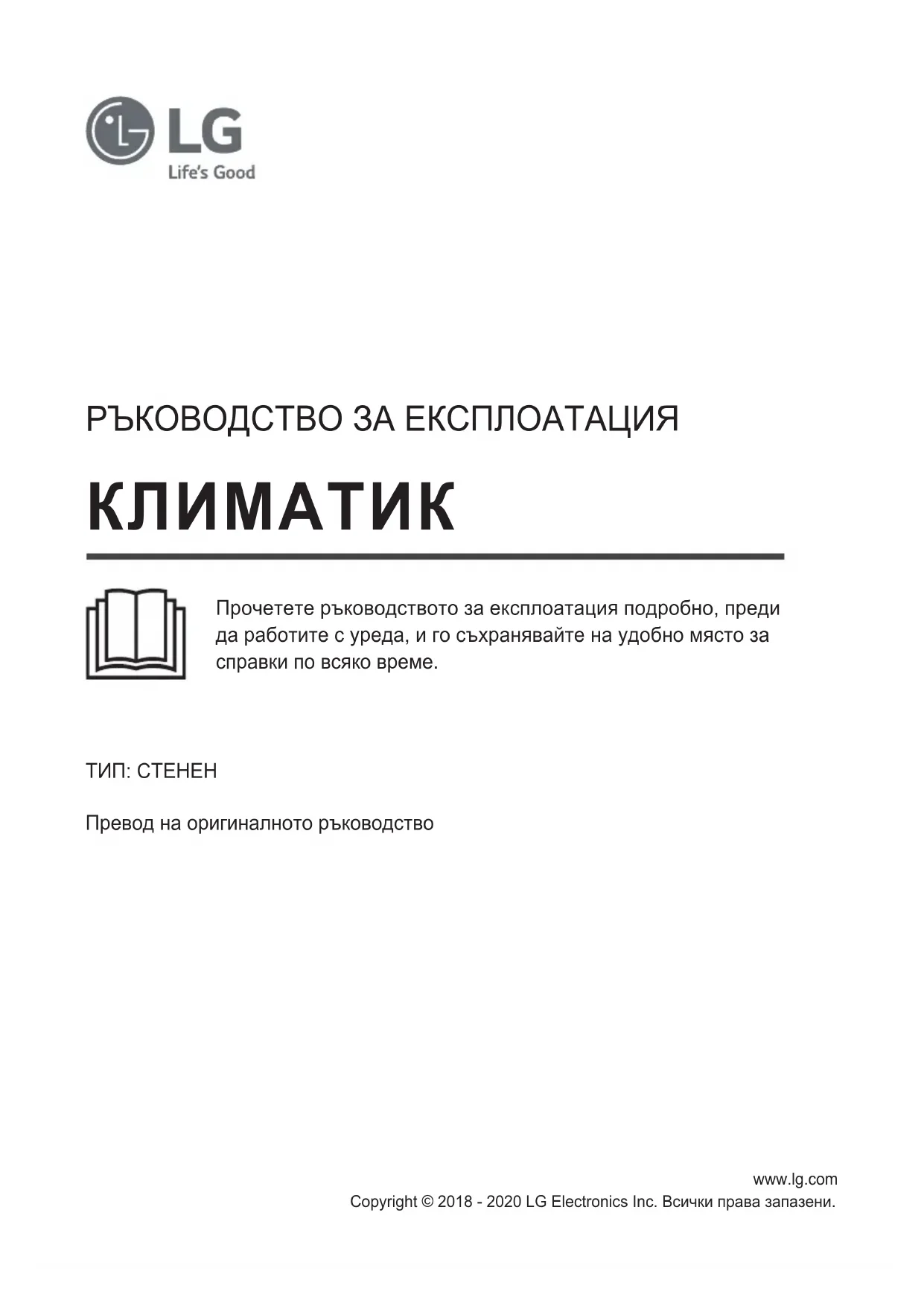 - Némelyik funkció bizonyos típusokban nem áll rendelkezésre.www.lg.com РЪКОВОДСТВО ЗА ЕКСПЛОАТАЦИЯ Copyright © 2018 - 2020 LG Electronics Inc. Всички права запазени. ТИП: СТЕНЕН Превод на оригиналното ръководство Прочетете ръководството за експлоатация подробно, преди да работите с уреда, и го съхранявайте на удобно място за справки по всяко време. КЛИМАТИКСЪДЪРЖАНИЕ Това ръководство може да съдържа изображения или съдържание, различно от модела, който сте закупили. Ръководството подлежи на редакция от производителя. ИНСТРУКЦИИ ЗА БЕЗОПАСНОСТ ..................................................................3 Важни инструкции за безопасност ...................................................................................................4 ЕКСПЛОАТАЦИЯ .....................................................................................................11 Бележки по експлоатацията ........................................................................................................... 11 Части и функции ................................................................................................................................. 11 Безжично дистанционно ..................................................................................................................12 Автоматично рестартиране на климатика .................................................................................17 Използване на функцията за режим ............................................................................................ 17 Използване на функцията „Режим на струя“ ............................................................................. 20 Използване на функцията за скорост на вентилатора ..........................................................21 Използване на функцията за насочване на въздушния поток ............................................21 Включване и изключване на таймера .........................................................................................22 Използване на функцията за заспиване (по избор) ................................................................ 23 Използване на функцията за стандартен таймер (по избор)...............................................23 Използване на функцията за показване на изразходената енергия (по избор) ............24 Използване на функцията за изключване на осветлението (по избор)............................24 Използване на функцията за удобна позиция на въздушния поток (по избор) ............. 24 Използване на функцията за управление на енергията (по избор) ..................................25 Използване на специални функции ............................................................................................. 25 ИНТЕЛИГЕНТНИ ФУНКЦИИ ..............................................................................27 Приложение LG ThinQ ......................................................................................................................27 Smart Diagnosis ....................................................................................................................................29 ПОДДРЪЖКА ............................................................................................................30 Почистване на въздушния филтър .............................................................................................. 32 ОТСТРАНЯВАНЕ НА НЕИЗПРАВНОСТИ ...................................................333 ИНСТРУКЦИИ ЗА БЕЗОПАСНОСТ