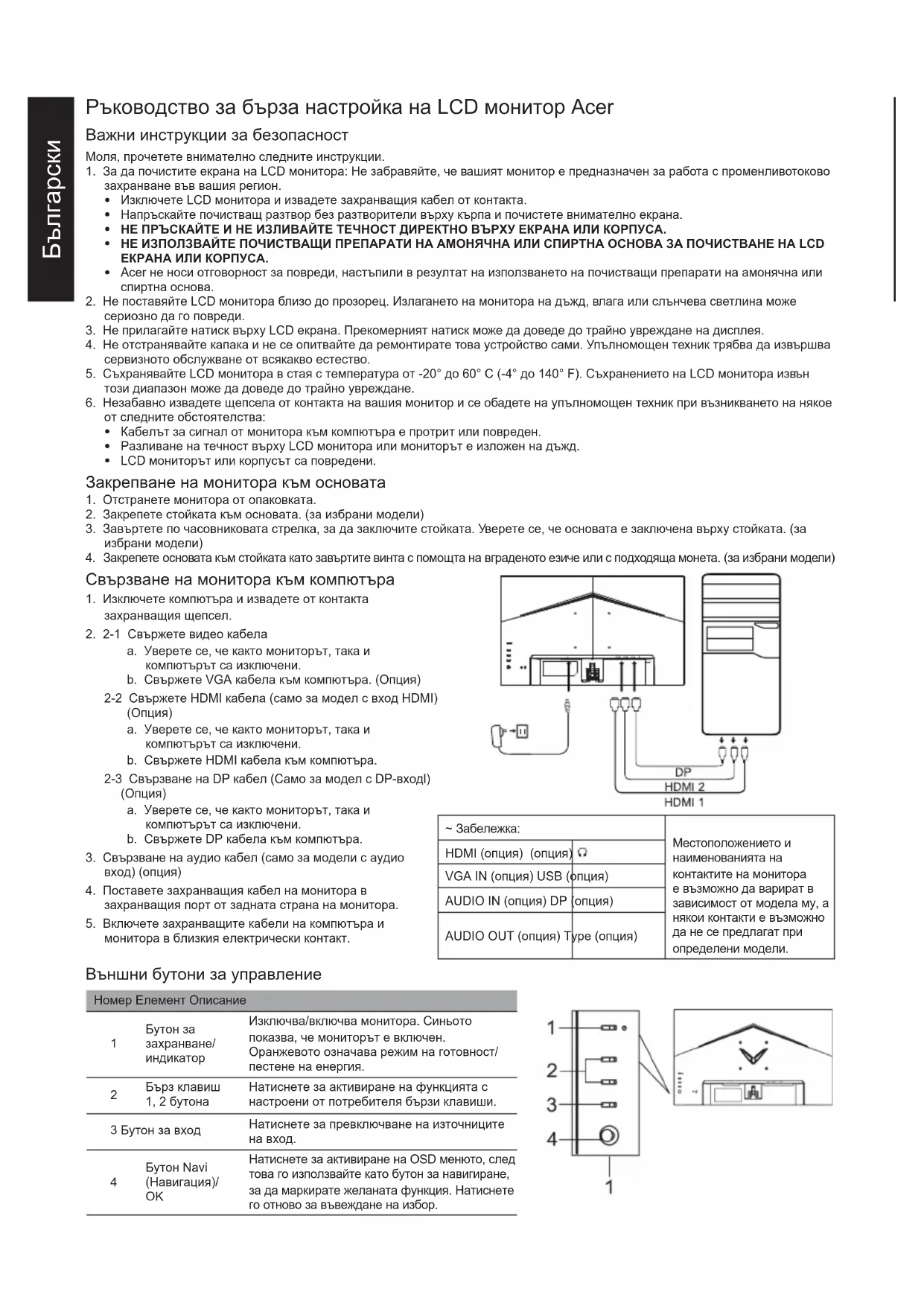 монитора в близкия електрически контакт. ~ Забележка: Местоположението и наименованията на контактите на монитора е възможно да варират в зависимост от модела му, а някои контакти е възможно да не се предлагат при определени модели. HDMI (опция) (опция) VGA IN (опция) USB (опция) AUDIO IN (опция) DP (опция) AUDIO OUT (опция) Type (опция) Външни бутони за управление Номер Елемент Описание