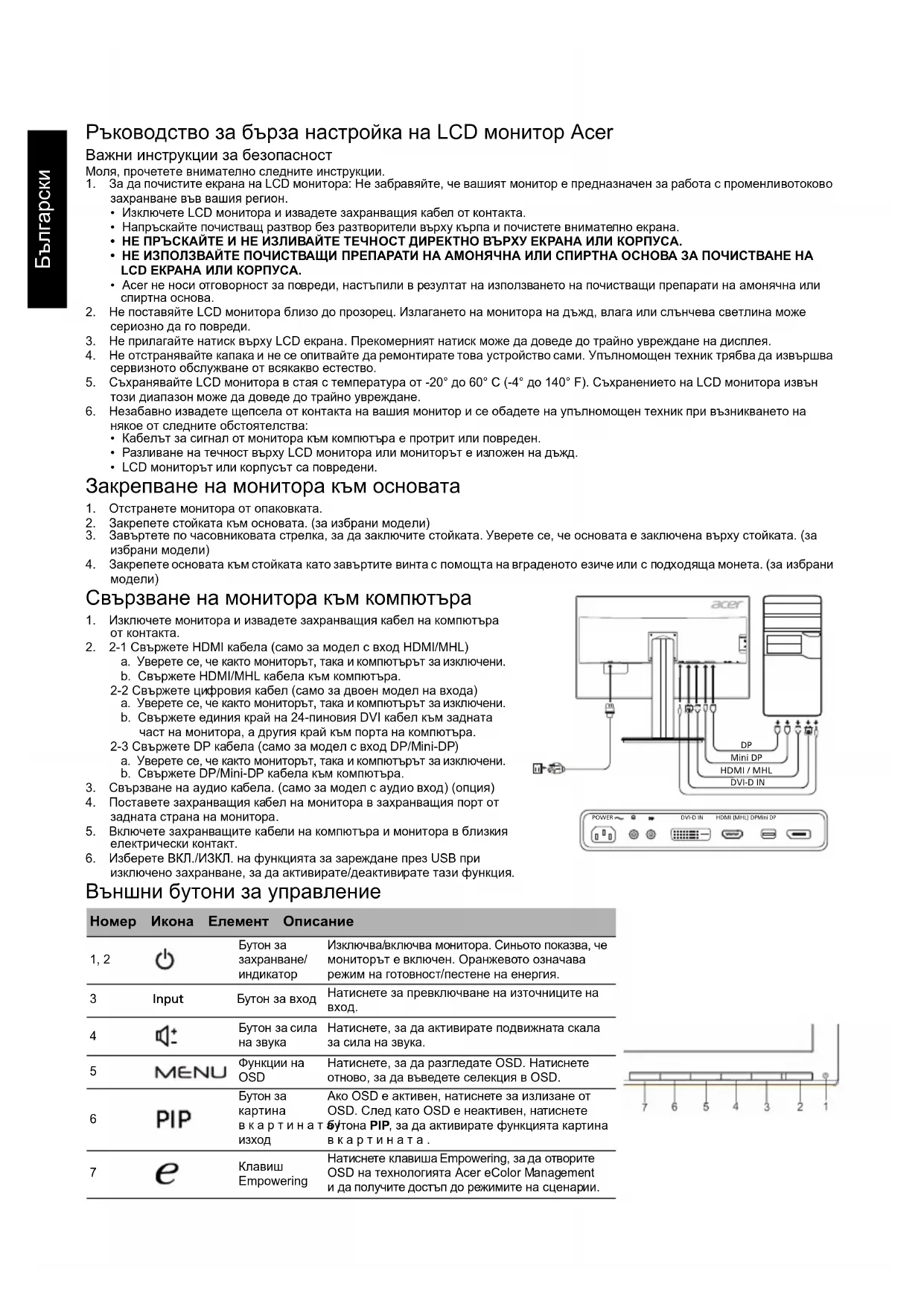 Empowering Натиснете клавиша Empowering, за да отворите OSD на технологията Acer eColor Management и да получите достъп до режимите на сценарии. POWERDVI-D INHDMI (MHL) DPMini DPMini DP DVI-D INHDMI / MHLPOWERDVI-D INHDMI (MHL) DPMini DPБългарски Разпоредби и бележки за безопасност Бележка от Федералната комисия за комуникации (ФКК) Това устройство е тествано и отговаря на ограниченията за цифрово устройство от клас B, съгласно част 15 от правилата на ФКК. Тези ограничения са предназначени да осигуряват разумна защита срещу вредни смущения в жилищни инсталации. Това устройство генерира, използва и може да излъчва радиочестотна енергия и ако не бъде монтирано и използвано, в съответствие с инструкциите, може да причини вредни смущения на радио комуникациите. Въпреки това, няма гаранции, че няма да възникнат смущения в конкретна инсталация. Ако устройството причинява вредни смущения на радио и телевизионно приемане, което може да се установи чрез изключване и включване на устройството, потребителят се насърчава да се опита да коригира смущението чрез една от следните мерки: Преориентиране или преместване на антената на приемника. Увеличаване на разстоянието между устройството и приемника. Свързване на устройството вконтакт във верига, която е различна от тази, вкоято е свързан приемникът. Консултация сдоставчик или опитен радио/телевизионен техник за помощ. CE декларация за съответствие С настоящето, Acer Inc., декларира, че този LCD монитор е в съответствие със съществените изисквания и други приложими разпоредби на директивата за електромагнитна съвместимост (EMC) 2014/30/ЕC, директивата за ниско напрежение 2014/35/ЕC и RoHS директивата 2011/65/ЕC, и директива 2009/125/EО по отношение на създаването на рамка за определяне на изискванията за екодизайн за продукти, свързани с енергопотребление.