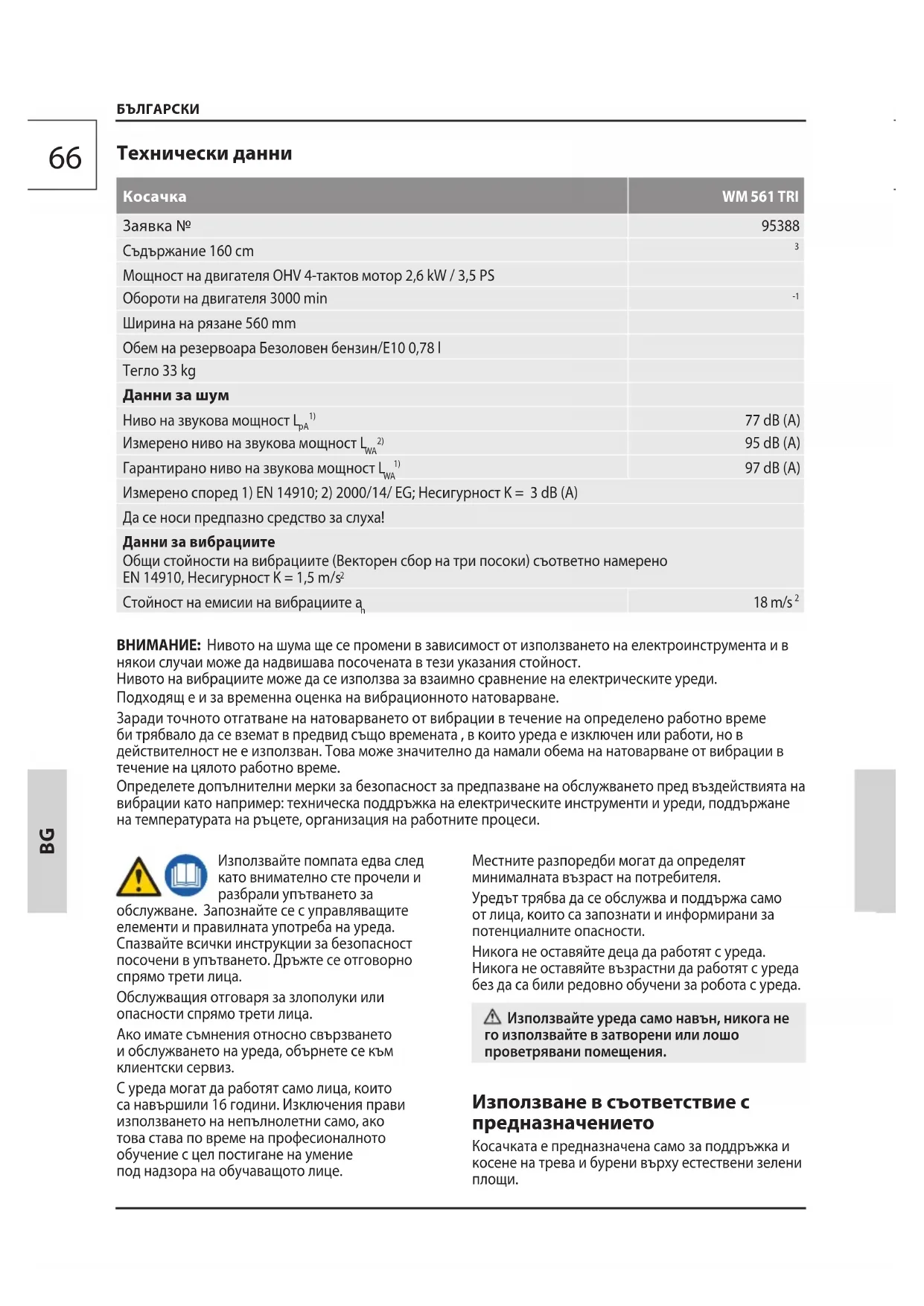 ВНИМАНИЕ: Нивото на шума ще се промени в зависимост от използването на електроинструмента и в някои случаи може да надвишава посочената в тези указания стойност. Нивото на вибрациите може да се използва за взаимно сравнение на електрическите уреди. Подходящ е и за временна оценка на вибрационното натоварване. Заради точното отгатване на натоварването от вибрации в течение на определено работно време би трябвало да се вземат в предвид също времената , в които уреда е изключен или работи, но в действителност не е използван. Това може значително да намали обема на натоварване от вибрации в течение на цялото работно време. Определете допълнителни мерки за безопасност за предпазване на обслужването пред въздействията на вибрации като например: техническа поддръжка на електрическите инструменти и уреди, поддържане на температурата на ръцете, организация на работните процеси. Използвайте помпата едва след като внимателно сте прочели и разбрали упътването за обслужване. Запознайте се с управляващите елементи и правилната употреба на уреда. Спазвайте всички инструкции за безопасност посочени в упътването. Дръжте се отговорно спрямо трети лица. Обслужващия отговаря за злополуки или опасности спрямо трети лица. Ако имате съмнения относно свързването и обслужването на уреда, обърнете се към клиентски сервиз. С уреда могат да работят само лица, които са навършили 16 години. Изключения прави използването на непълнолетни само, ако това става по време на професионалното обучение с цел постигане на умение под надзора на обучаващото лице. Местните разпоредби могат да определят минималната възраст на потребителя. Уредът трябва да се обслужва и поддържа само от лица, които са запознати и информирани за потенциалните опасности. Никога не оставяйте деца да работят с уреда. Никога не оставяйте възрастни да работят с уреда без да са били редовно обучени за робота с уреда. Използвайте уреда само навън, никога не го използвайте в затворени или лошо проветрявани помещения. Използване в съответствие с предназначението Косачката е предназначена само за поддръжка и косене на трева и бурени върху естествени зелени
