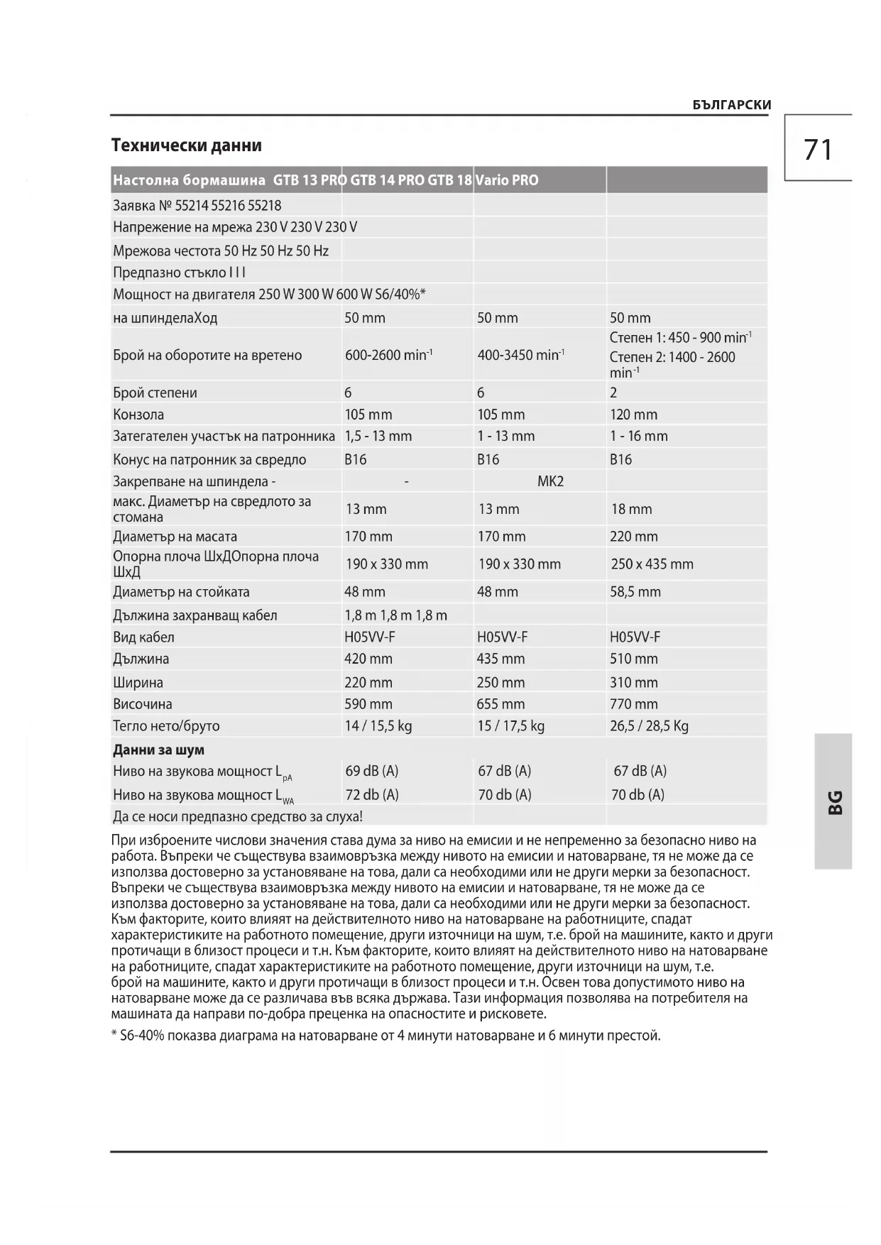 72 db (A) 70 db (A) 70 db (A) Да се носи предпазно средство за слуха! При изброените числови значения става дума за ниво на емисии и не непременно за безопасно ниво на работа. Въпреки че съществува взаимовръзка между нивото на емисии и натоварване, тя не може да се използва достоверно за установяване на това, дали са необходими или не други мерки за безопасност. Въпреки че съществува взаимовръзка между нивото на емисии и натоварване, тя не може да се използва достоверно за установяване на това, дали са необходими или не други мерки за безопасност. Към факторите, които влияят на действителното ниво на натоварване на работниците, спадат характеристиките на работното помещение, други източници на шум, т.е. брой на машините, както и други протичащи в близост процеси и т.н. Към факторите, които влияят на действителното ниво на натоварване на работниците, спадат характеристиките на работното помещение, други източници на шум, т.е. брой на машините, както и други протичащи в близост процеси и т.н. Освен това допустимото ниво на натоварване може да се различава във всяка държава. Тази информация позволява на потребителя на машината да направи по-добра преценка на опасностите и рисковете.