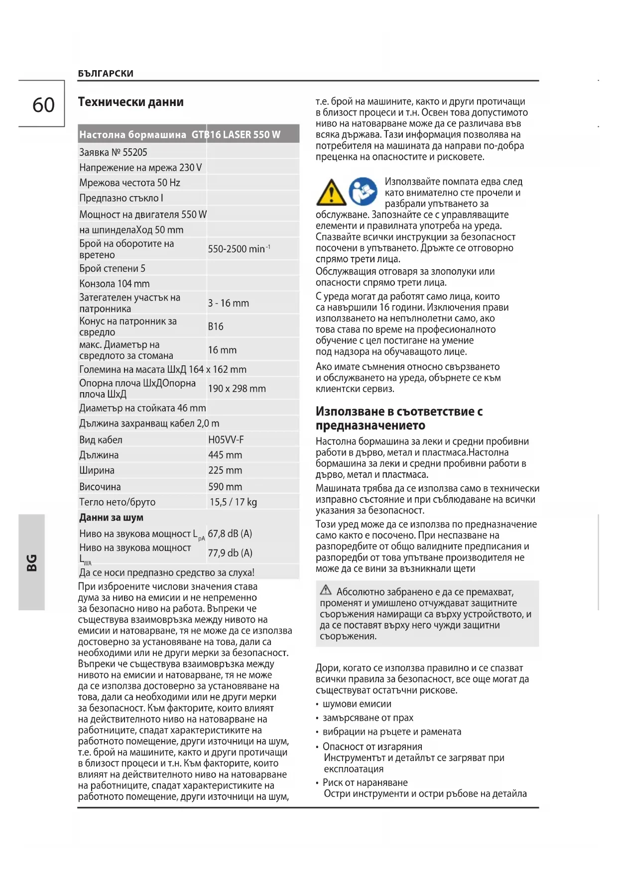 77,9 db (A) Да се носи предпазно средство за слуха! При изброените числови значения става дума за ниво на емисии и не непременно за безопасно ниво на работа. Въпреки че съществува взаимовръзка между нивото на емисии и натоварване, тя не може да се използва достоверно за установяване на това, дали са необходими или не други мерки за безопасност. Въпреки че съществува взаимовръзка между нивото на емисии и натоварване, тя не може да се използва достоверно за установяване на това, дали са необходими или не други мерки за безопасност. Към факторите, които влияят на действителното ниво на натоварване на работниците, спадат характеристиките на работното помещение, други източници на шум, т.е. брой на машините, както и други протичащи в близост процеси и т.н. Към факторите, които влияят на действителното ниво на натоварване на работниците, спадат характеристиките на работното помещение, други източници на шум, т.е. брой на машините, както и други протичащи в близост процеси и т.н. Освен това допустимото ниво на натоварване може да се различава във всяка държава. Тази информация позволява на потребителя на машината да направи по-добра преценка на опасностите и рисковете. Използвайте помпата едва след като внимателно сте прочели и разбрали упътването за обслужване. Запознайте се с управляващите елементи и правилната употреба на уреда. Спазвайте всички инструкции за безопасност посочени в упътването. Дръжте се отговорно спрямо трети лица. Обслужващия отговаря за злополуки или опасности спрямо трети лица. С уреда могат да работят само лица, които са навършили 16 години. Изключения прави използването на непълнолетни само, ако това става по време на професионалното обучение с цел постигане на умение под надзора на обучаващото лице. Ако имате съмнения относно свързването и обслужването на уреда, обърнете се към клиентски сервиз. Използване в съответствие с предназначението Настолна бормашина за леки и средни пробивни работи в дърво, метал и пластмаса.Настолна бормашина за леки и средни пробивни работи в дърво, метал и пластмаса. Машината трябва да се използва само в технически изправно състояние и при съблюдаване на всички указания за безопасност. Този уред може да се използва по предназначение само както е посочено. При неспазване на разпоредбите от общо валидните предписания и разпоредби от това упътване производителя не може да се вини за възникнали щети Абсолютно забранено е да се премахват, променят и умишлено отчуждават защитните съоръжения намиращи са върху устройството, и да се поставят върху него чужди защитни съоръжения. Дори, когато се използва правилно и се спазват всички правила за безопасност, все още могат да съществуват остатъчни рискове.