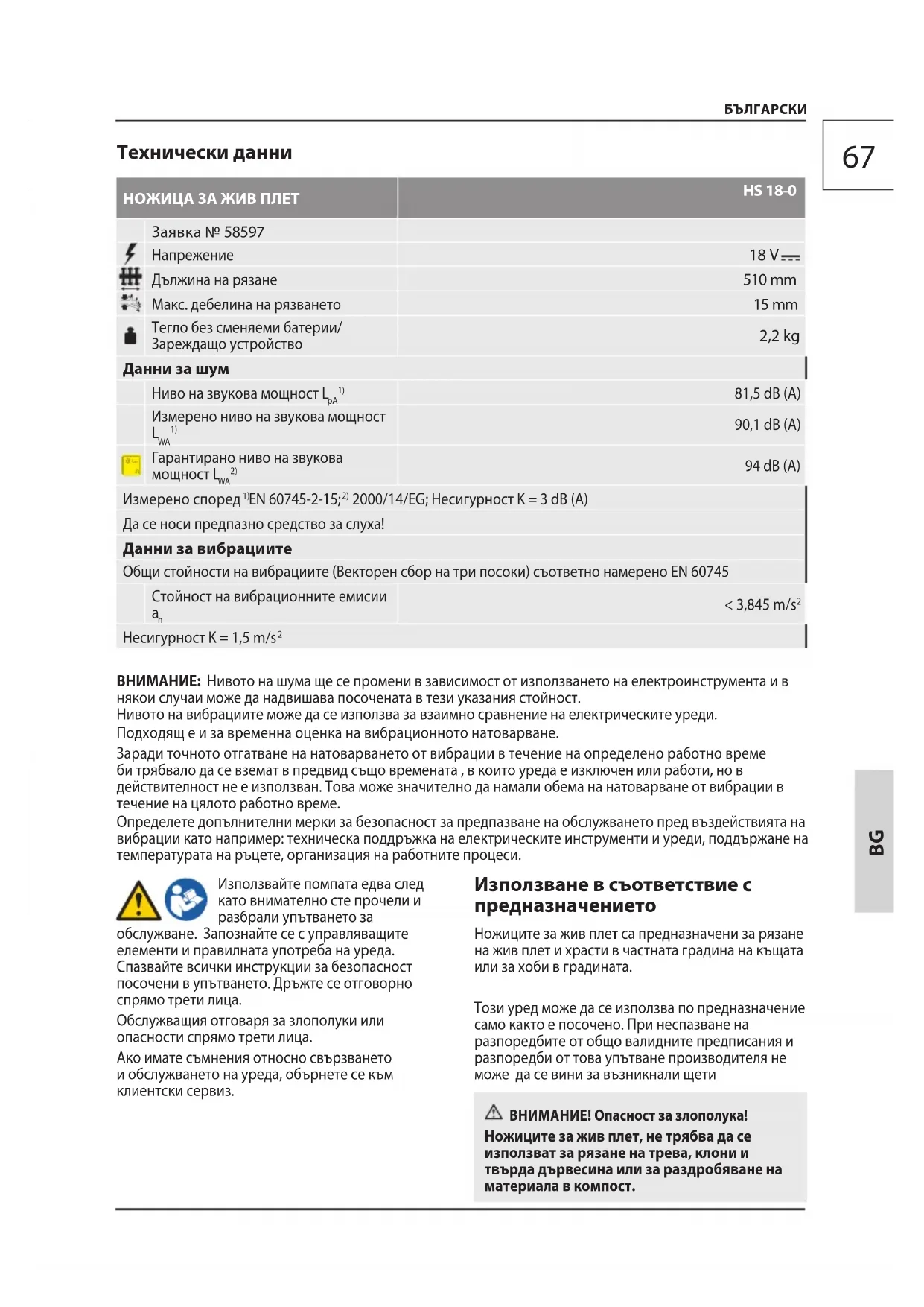 Използвайте помпата едва след като внимателно сте прочели и разбрали упътването за обслужване. Запознайте се с управляващите елементи и правилната употреба на уреда. Спазвайте всички инструкции за безопасност посочени в упътването. Дръжте се отговорно спрямо трети лица. Обслужващия отговаря за злополуки или опасности спрямо трети лица. Ако имате съмнения относно свързването и обслужването на уреда, обърнете се към клиентски сервиз. Използване в съответствие с предназначението Ножиците за жив плет са предназначени за рязане на жив плет и храсти в частната градина на къщата или за хоби в градината. Този уред може да се използва по предназначение само както е посочено. При неспазване на разпоредбите от общо валидните предписания и разпоредби от това упътване производителя не може да се вини за възникнали щети ВНИМАНИЕ! Опасност за злополука! Ножиците за жив плет, не трябва да се използват за рязане на трева, клони и твърда дървесина или за раздробяване на материала в компост. BGD