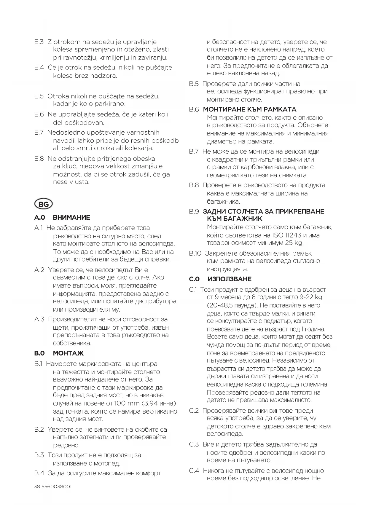 B.9 ЗАДНИ СТОЛЧЕТА ЗА ПРИКРЕПВАНЕ КЪМ БАГАЖНИК Монтирайте столчето само към багажник, който съответства на ISO 11243 и има товароносимост минимум 25 kg. B.10 Закрепете обезопасителния ремък към рамката на велосипеда съгласно инструкцията. C.0 ИЗПОЛЗВАНЕ C.1 Този продукт е одобрен за деца на възраст от 9 месеца до 6 години с тегло 9-22 kg (20-48,5 паунда). Не поставяйте в него деца, които са твърде малки, и винаги се консултирайте с педиатър, когато превозвате дете на възраст под 1 година. Возете само деца, които могат да седят без чужда помощ за по-дълъг период от време, поне за времетраенето на предвиденото пътуване с велосипед. Независимо от възрастта си детето трябва да може да държи главата си изправена и да носи велосипедна каска с подходяща големина. Проверявайте редовно дали теглото на детето не превишава максималното. C.2 Проверявайте всички винтове преди всяка употреба, за да се уверите, чу детското столче е здраво закрепено към велосипеда. C.3 Вие и детето трябва задължително да носите одобрени велосипедни каски по време на пътуването. C.4 Никога не пътувайте с велосипед нощно време без подходящо осветление. Не395560038001 покривайте задните рефлектори или задните светлини, когато използвате детското столче на велосипеда. C.5 Наличието на детско столче за велосипед може да наложи промени в начина по който се качвате на/слизате от велосипеда. Моля, обърнете на това специално внимание. C.6 Преди всяко пътуване се уверявайте, че монтираното столче за велосипед не пречи на спирачките, педалите или управлението. C.7 Винаги използвайте ремъците и се уверявайте, че сте закрепили правилно детето с тях. Уверявайте се, че общите ремъци и тези през краката не са разхлабени и не могат да се захванат в движещите се части, например в колелата. това трябва да се спазва и когато използвате велосипеда, без да има дете в столчето. C.8 Уверете се, че дрехите, обувките, играчките или части от тялото на детето не влизат в контакт с движещите се части на велосипеда, например с колелата, кабелите и пружините на седалката. Правете редовно тази проверка, тъй като детето расте. Можете да покриете пружините на седалката с подходящ протектор за пружини. C.9 Уверете се, че в обсега на детето няма остри предмети, например протъркани