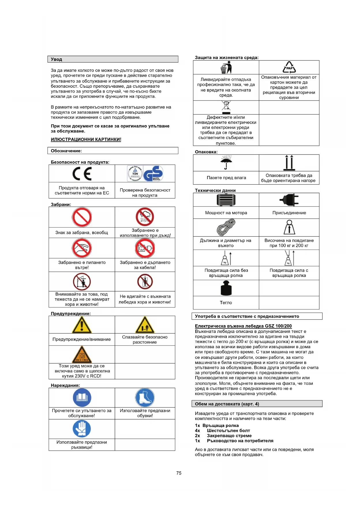 Употреба в съответствие с предназначението Електрическа въжена лебедка GSZ 100/200 Въжената лебедка описана в долунаписания текст е предназначена изключително за вдигане на твърди тежести с тегло до 200 кг (с връщаща ролка) и може да се използва за всички видове работи извършвани в дома или през свободното време. С тази машина не могат да се извършват други работи, освен работи, за които