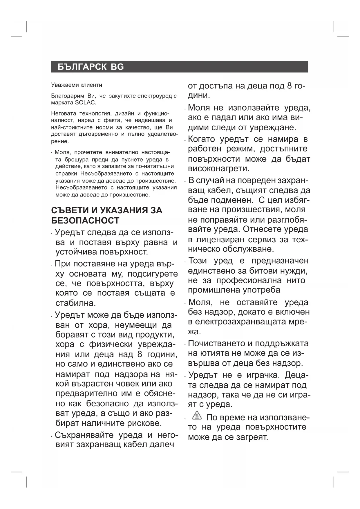 - В изделието няма концентрации на веще- ства, които могат да бъдат определени като вредни за околната среда. Този символ означава, че ако желаете да се освободите от уреда след изти- чане на експлоатационният му живот трябва да го предадете по подходящ начин на фирма за преработка на отпадъци, ото- ризирана за разделно събиране на относно отпадъци от електрическо и електронно обо- рудване (ОЕЕО). Настоящият уред изпълнява Директива 2014/35/EC за ниски напрежения, Директива 2014/30/EC за електромагнетично съответ- ствие и с Директива 2011/65/ЕU за ограни- ченията при употреба на някои определени опасни вещества в електрически и електрон- ни апарати и Директива 2009/125/ EC за съз- даване на рамка за определяне на изисква- нията за екодизайн към продукти, свързани с енергопотреблението.ROMÂNA RO Stimate client, Vă mulțumim pentru că ați ales să cumpărați un produs marca SOLAC. Datorită tehnologiei sale, designului ți modului de funcționare, precum ți faptului că depățețte cele mai stricte standarde de calitate, se poate garanta o utilizare complet satisfăcătoare ți de lungă durată a produsului.