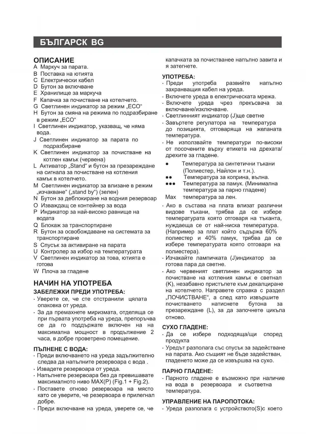J Светлинен индикатор за парата по подразбиране K Светлинен индикатор за почистване на котлен камък (червена) L Активатор „Stand“ и бутон за презареждане на сигнала за почистване на котления камък в котелчето. M Светлинен индикатор за влизане в режим „изчакване“ („stand by“) (зелен) N Бутон за деблокиране на водния резервоар O Изваждащ се контейнер за вода P Индикатор за най-високо равнище на