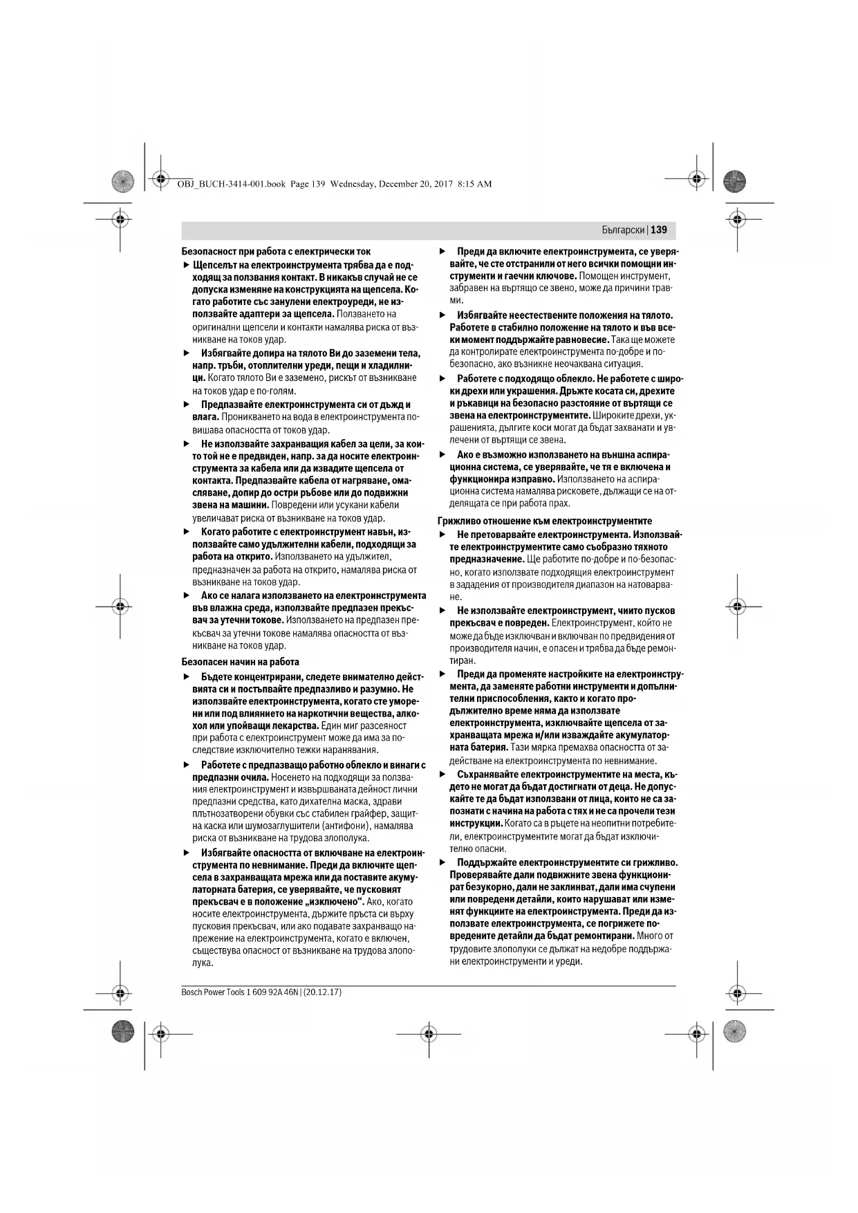 Не работете с електроинструмента в среда с пови- шена опасност от възникване на експлозия, в бли- зост до леснозапалими течности, газове или прахо- образни материали. По време на работа в електроинструментите се отделят искри, които могат да възпламенят прахообразни материали или пари. Дръжте деца и странични лица на безопасно раз- стояние, докато работите с електроинструмента. Ако вниманието Ви бъде отклонено, може да загубите контрола над електроинструмента. OBJ_BUCH-3414-001.book Page 138 Wednesday, December 20, 2017 8:15 AMБългарски | 139 Bosch Power Tools 1 609 92A 46N | (20.12.17) Безопасност при работа с електрически ток Щепселът на електроинструмента трябва да е под- ходящ за ползвания контакт. В никакъв случай не се допуска изменяне на конструкцията на щепсела. Ко- гато работите със занулени електроуреди, не из- ползвайте адаптери за щепсела. Ползването на оригинални щепсели и контакти намалява риска от въз- никване на токов удар. Избягвайте допира на тялото Ви до заземени тела, напр. тръби, отоплителни уреди, пещи и хладилни- ци. Когато тялото Ви е заземено, рискът от възникване на токов удар е по-голям. Предпазвайте електроинструмента си от дъжд и влага. Проникването на вода в електроинструмента по- вишава опасността от токов удар. Не използвайте захранващия кабел за цели, за кои- то той не е предвиден, напр. за да носите електроин- струмента за кабела или да извадите щепсела от контакта. Предпазвайте кабела от нагряване, ома- сляване, допир до остри ръбове или до подвижни звена на машини. Повредени или усукани кабели увеличават риска от възникване на токов удар. Когато работите с електроинструмент навън, из- ползвайте само удължителни кабели, подходящи за работа на открито. Използването на удължител, предназначен за работа на открито, намалява риска от възникване на токов удар. Ако се налага използването на електроинструмента във влажна среда, използвайте предпазен прекъс- вач за утечни токове. Използването на предпазен пре- късвач за утечни токове намалява опасността от въз- никване на токов удар. Безопасен начин на работа Бъдете концентрирани, следете внимателно дейст- вията си и постъпвайте предпазливо и разумно. Не използвайте електроинструмента, когато сте уморе- ни или под влиянието на наркотични вещества, алко- хол или упойващи лекарства. Един миг разсеяност при работа с електроинструмент може да има за по- следствие изключително тежки наранявания. Работете с предпазващо работно облекло и винаги с предпазни очила. Носенето на подходящи за ползва- ния електроинструмент и извършваната дейност лични предпазни средства, като дихателна маска, здрави плътнозатворени обувки със стабилен грайфер, защит- на каска или шумозаглушители (антифони), намалява риска от възникване на трудова злополука. Избягвайте опасността от включване на електроин- струмента по невнимание. Преди да включите щеп- села в захранващата мрежа или да поставите акуму- латорната батерия, се уверявайте, че пусковият прекъсвач е в положение „изключено“. Ако, когато носите електроинструмента, държите пръста си върху пусковия прекъсвач, или ако подавате захранващо на- прежение на електроинструмента, когато е включен, съществува опасност от възникване на трудова злопо-
