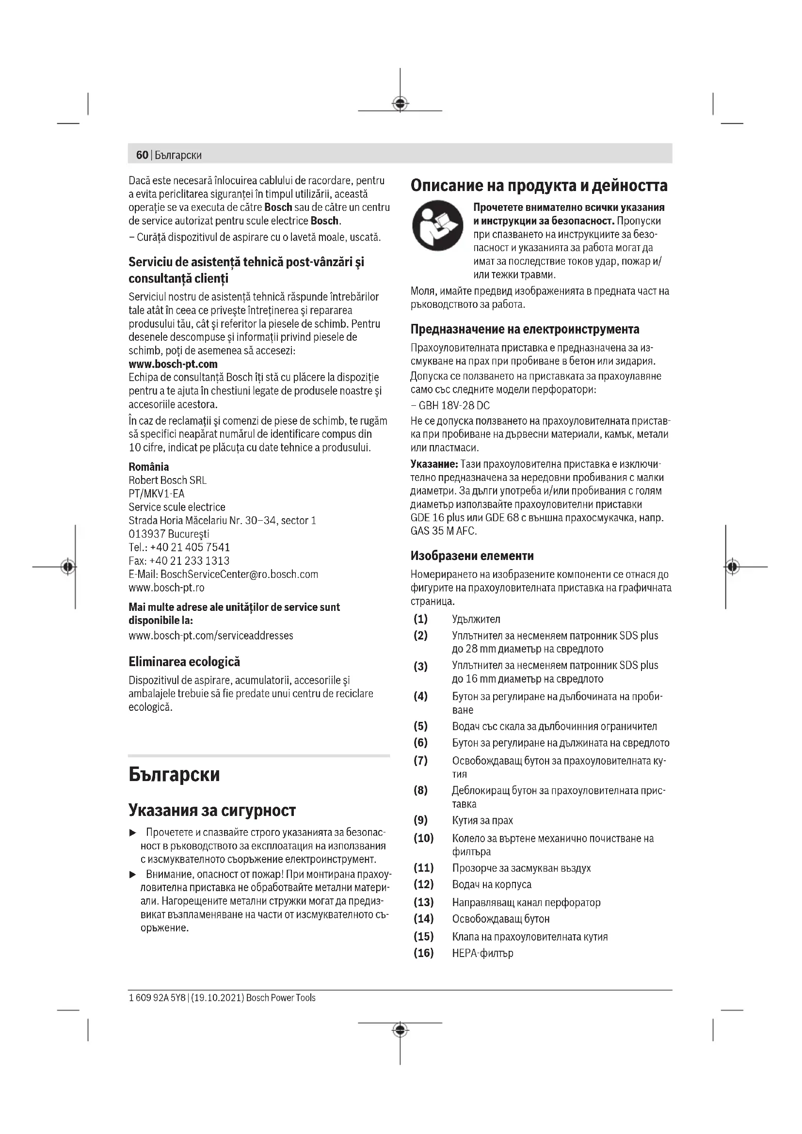 (11) Прозорче за засмукван въздух (12) Водач на корпуса (13) Направляващ канал перфоратор (14) Освобождаващ бутон (15) Клапа на прахоуловителната кутия (16) HEPA-филтър 1 609 92A 5Y8 | (19.10.2021) Bosch Power ToolsБългарски | 61 Технически данни Прахоуловителна приставка GDE28D Каталожен номер 1 600 A02 1CV 1 600 A02 1CY Диаметър на свредлото