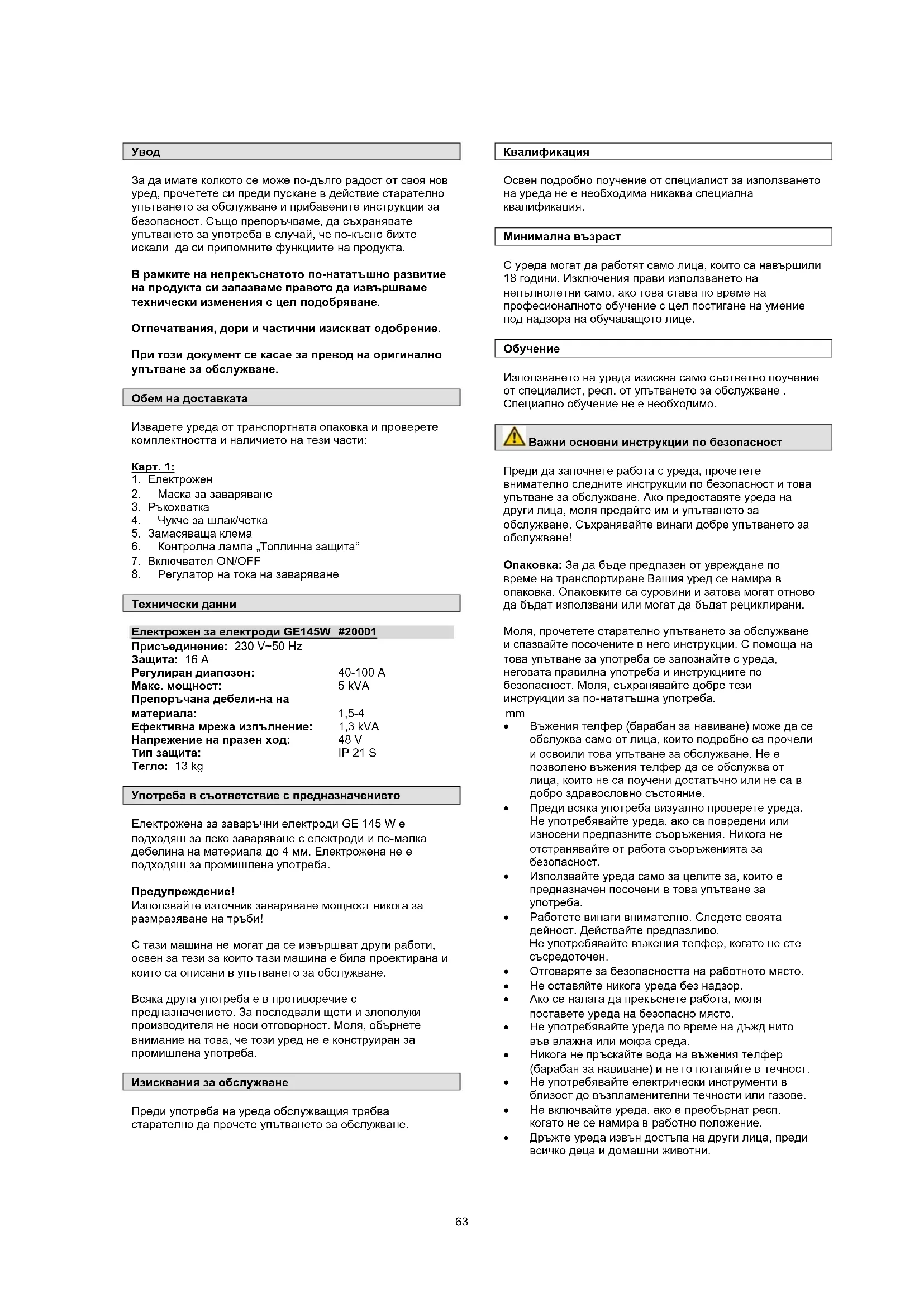 Технически данни Електрожен за електроди GE145W #20001 Присъединение: 230 V~50 Hz Защита: 16 A Регулиран диапозон: 40-100 A Макс. мощност: 5 kVA Препоръчана дебели-на на материала: 1,5-4 mm Ефективна мрежа изпълнение: 1,3 kVA Напрежение на празен ход: 48 V Тип защита: IP 21 S Тегло: 13 kg Употреба в съответствие с предназначението Електрожена за заваръчни електроди GE 145 W е подходящ за леко заваряване с електроди и по-малка дебелина на материала до 4 мм. Електрожена не е подходящ за промишлена употреба. Предупреждение! Използвайте източник заваряване мощност никога за размразяване на тръби! С тази машина не могат да се извършват други работи, освен за тези за които та зи машина е била проектирана и които са описани в упътването за обслужване. Всяка друга употреба е в противоречие с предназначението. За последвали щети и злополуки производителя не носи отговорност. Моля, обърнете внимание на това, че този уред не е конструиран за промишлена употреба. Изисквания за обслужване Преди употреба на уреда обслужващия трябва старателно да прочете упътването за обслужване.