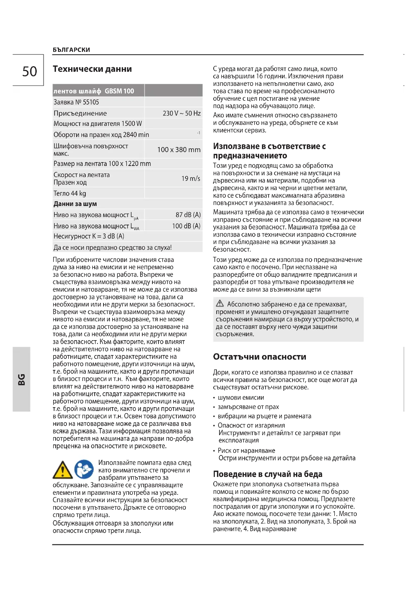 100 dB (A) Несигурност K = 3 dB (A) Да се носи предпазно средство за слуха! При изброените числови значения става дума за ниво на емисии и не непременно за безопасно ниво на работа. Въпреки че съществува взаимовръзка между нивото на емисии и натоварване, тя не може да се използва достоверно за установяване на това, дали са необходими или не други мерки за безопасност. Въпреки че съществува взаимовръзка между нивото на емисии и натоварване, тя не може да се използва достоверно за установяване на това, дали са необходими или не други мерки за безопасност. Към факторите, които влияят на действителното ниво на натоварване на работниците, спадат характеристиките на работното помещение, други източници на шум, т.е. брой на машините, както и други протичащи в близост процеси и т.н. Към факторите, които влияят на действителното ниво на натоварване на работниците, спадат характеристиките на работното помещение, други източници на шум, т.е. брой на машините, както и други протичащи в близост процеси и т.н. Освен това допустимото ниво на натоварване може да се различава във всяка държава. Тази информация позволява на потребителя на машината да направи по-добра преценка на опасностите и рисковете. Използвайте помпата едва след като внимателно сте прочели и разбрали упътването за обслужване. Запознайте се с управляващите елементи и правилната употреба на уреда. Спазвайте всички инструкции за безопасност посочени в упътването. Дръжте се отговорно спрямо трети лица. Обслужващия отговаря за злополуки или опасности спрямо трети лица. С уреда могат да работят само лица, които са навършили 16 години. Изключения прави използването на непълнолетни само, ако това става по време на професионалното обучение с цел постигане на умение под надзора на обучаващото лице. Ако имате съмнения относно свързването и обслужването на уреда, обърнете се към клиентски сервиз. Използване в съответствие с предназначението Този уред е подходящ само за обработка на повърхности и за снемане на мустаци на дървесина или на материали, подобни на дървесина, както и на черни и цветни метали, като се съблюдават максималната абразивна повърхност и указанията за безопасност. Машината трябва да се използва само в технически изправно състояние и при съблюдаване на всички указания за безопасност. Машината трябва да се използва само в технически изправно състояние и при съблюдаване на всички указания за безопасност. Този уред може да се използва по предназначение само както е посочено. При неспазване на разпоредбите от общо валидните предписания и разпоредби от това упътване производителя не може да се вини за възникнали щети Абсолютно забранено е да се премахват, променят и умишлено отчуждават защитните съоръжения намиращи са върху устройството, и да се поставят върху него чужди защитни съоръжения. Остатъчни опасности Дори, когато се използва правилно и се спазват всички правила за безопасност, все още могат да съществуват остатъчни рискове.